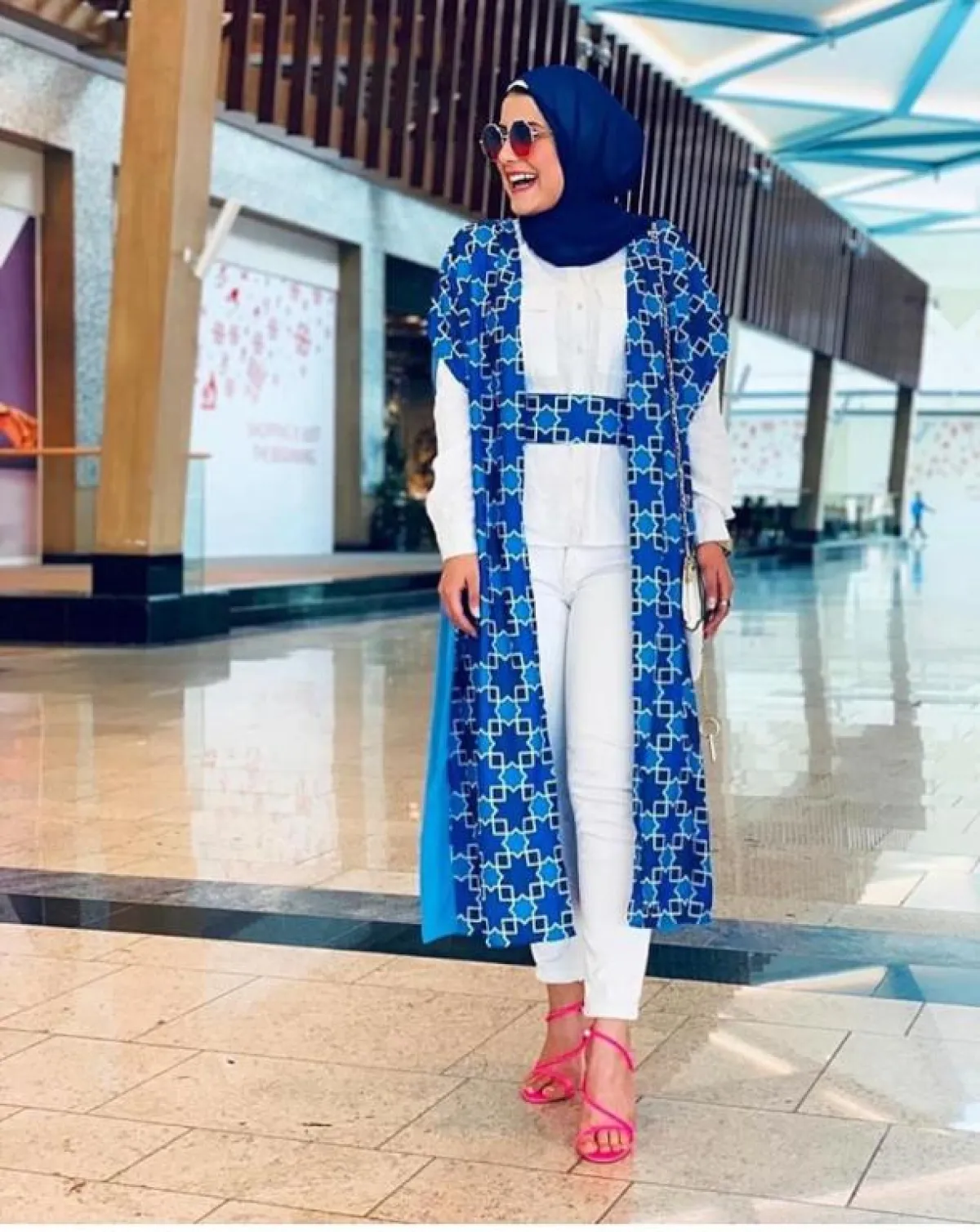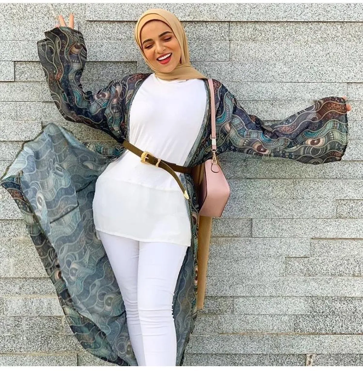 ليس شرطا أن تعتمدي الكارديغان بألون محايدة من دون رسومات، فما زال الصيف يحتاج للكثير من الستايلات غير التقليدية، كهذا الكادريغان الطويل من المدونة نورهان حسن، مع رسومات النجوم باللون الأزرق الزهري، نسقته مع إطلالة محايدة باللون الأبيض، وحذاء أنثوي فوشي باللون البينك، مناسب للصبايا المحجبات القصيرات والممتلئات أيضا، فهذا الكادريغان مع الرسومات المختلفة قد يخفي عيوب القوام.