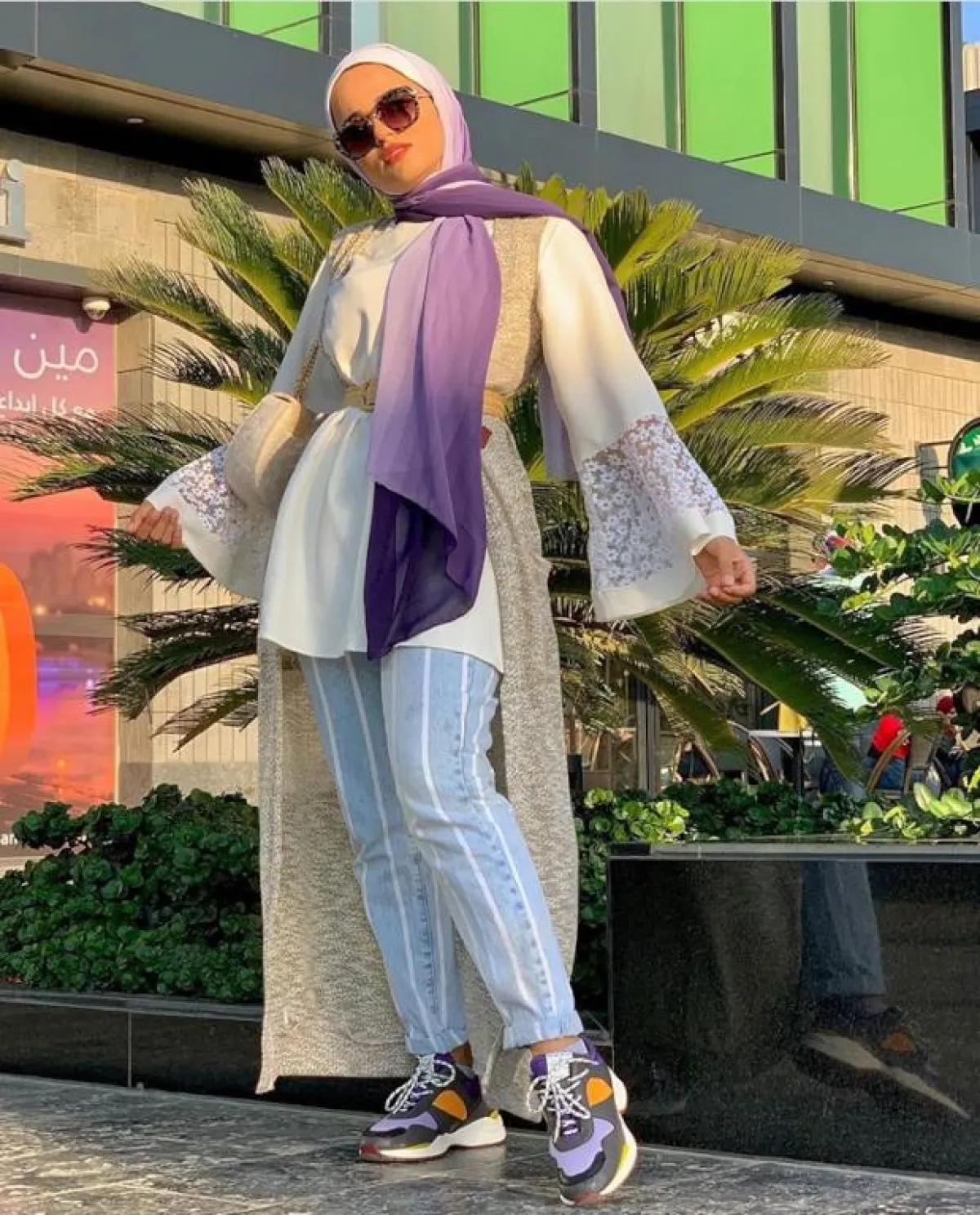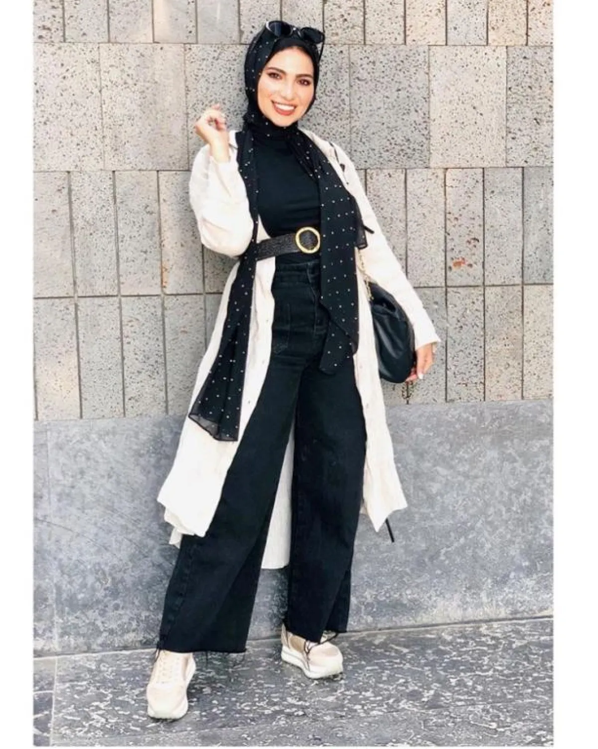 نسقيه مع البلوزات القصيرة ذات الأكمام الطويلة التي تريدين إبراز جمالها، كهذه الإطلالة من سهر فؤاد للبليزر الطويل مع الجينز المخطط، وحزام الخصر، اعتمدته بألوان البيج والأوف وايت لإطلالة هادئة، بينما جاء الحجاب بتدرجات الموف ليلفت الأنظار.