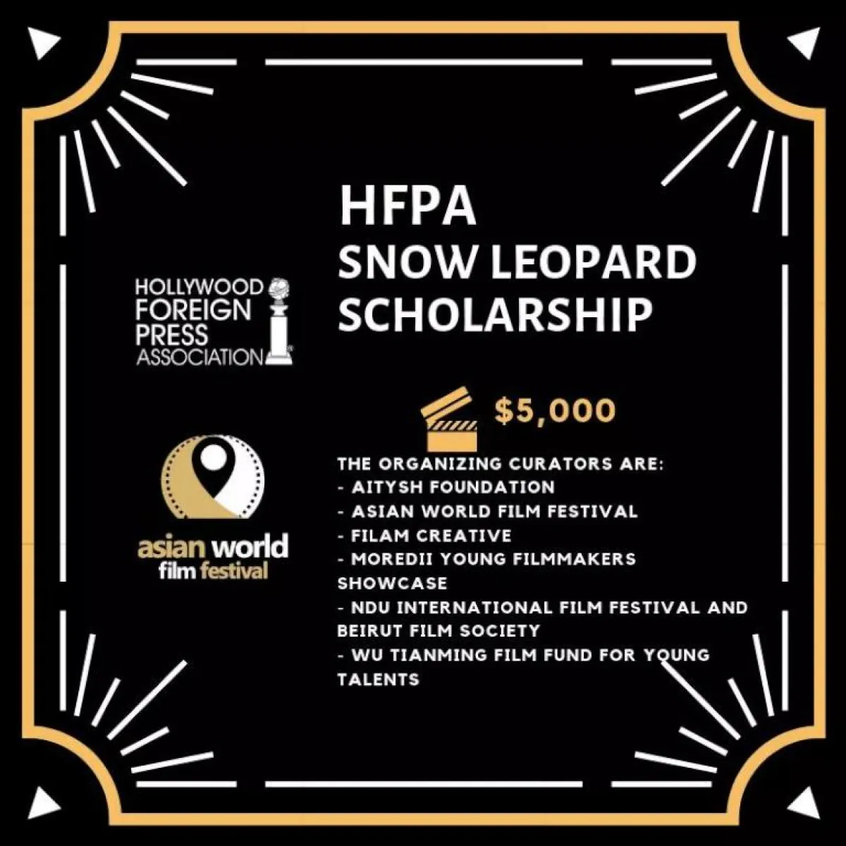 يتم اعلان الجائزة ضمن فعاليات Asian World Film Festival في لوس أنجلوس في إطار إتفاقية أُبرمت بين المهرجان وهيئة الـGolden Globes وتبلغ قيمتها 5000 دولار أميركي لأفضل فيلم قصير من دول آسيا بالإضافة إلى الحصول على دعوة لحضور وقائع حفل توزيع جوائز الغولدن غلوبز .