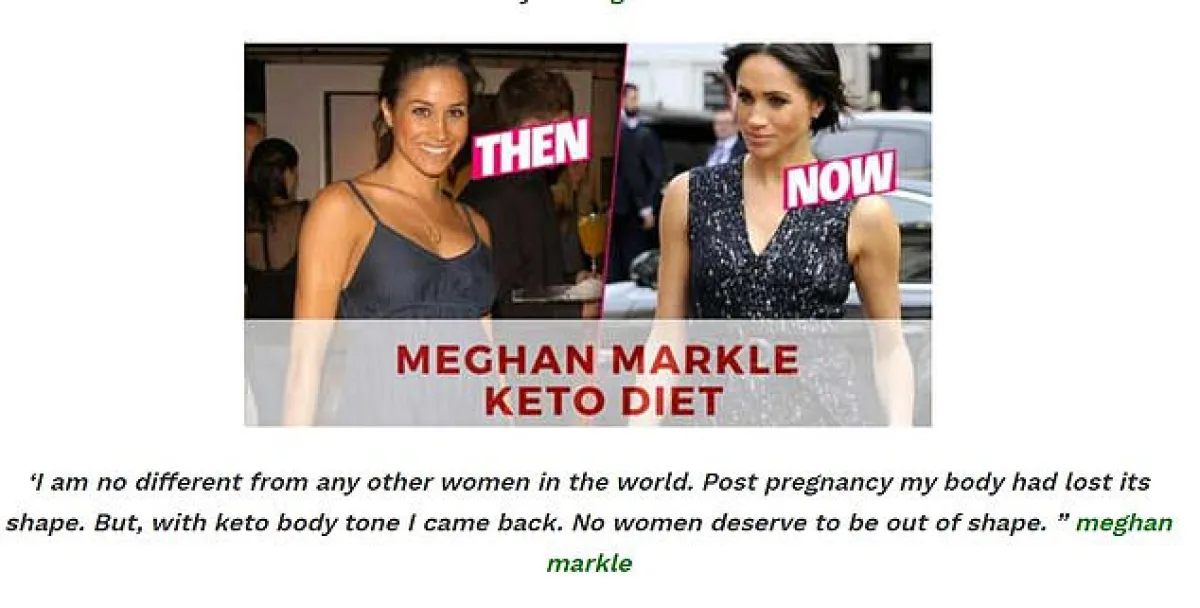 ويقول إحدى الإعلانات المنتشرة على وسائل التواصل الاجتماعي، على لسان ميغان ماركل: “لا أختلف عن أي نساء أخريات في العالم.. بعد الحمل فقد جسدي شكله، لكن مع استخدام (كيتو) عدت.. لا توجد امرأة تستحق أن تكون بعيدة عن المظهر المثالي”.