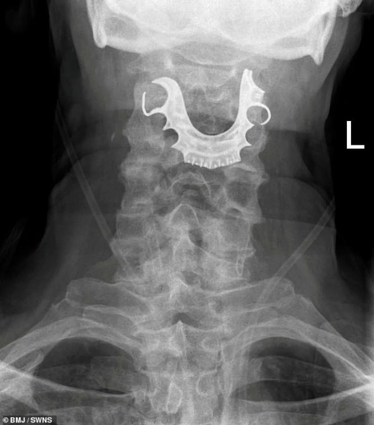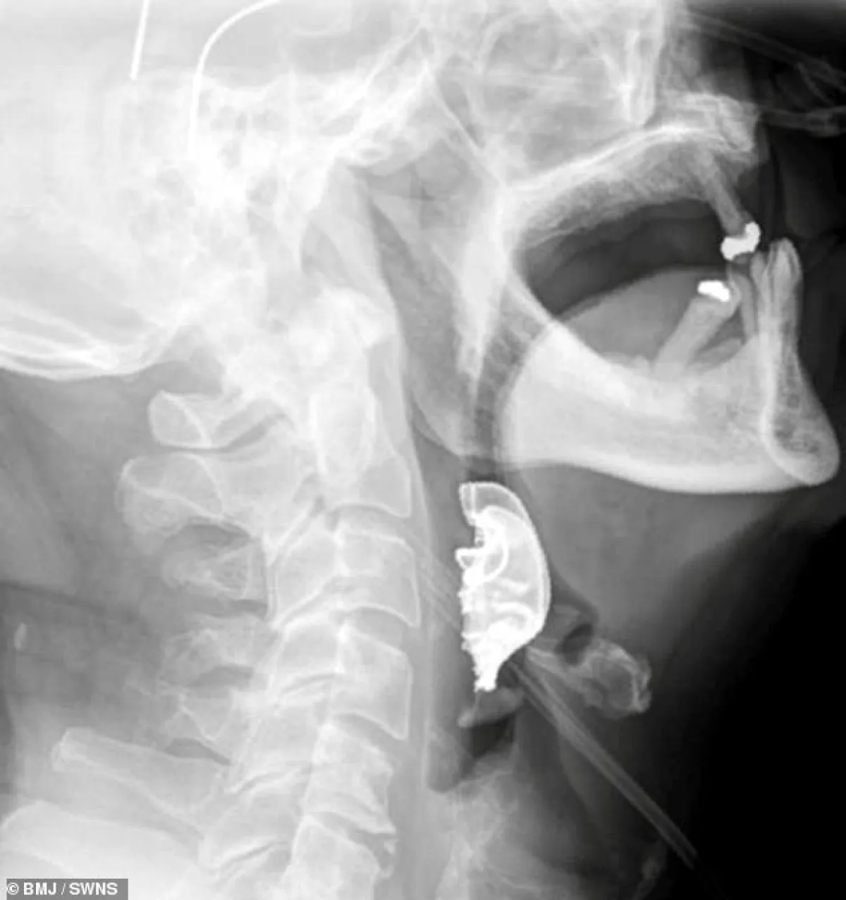 وعندما خضع للفحص، اكتشف الأطباء وجود جسم نصف دائري في حلقه حول الأحبال الصوتية، مما أدى إلى التهابات داخلية، وأثبتت الأشعة الضوئية أن هذا الجسم هو طاقم الأسنان.