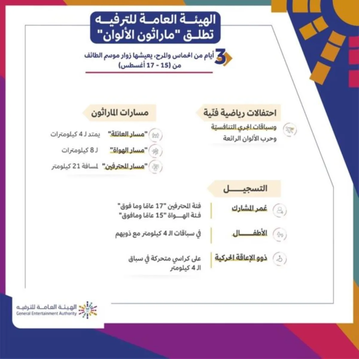 وتأتي إقامة ماراثون الألوان في إطار اهتمام الهيئة العامة للترفيه بتنظيم مسابقات رياضية ممتعة لجعل الرياضة أسلوباً متكاملاً للحياة، وإيجاد نوع من المنافسة الترفيهية لتفعيل الدور المجتمعي والتوعوي لكل فئات المجتمع.