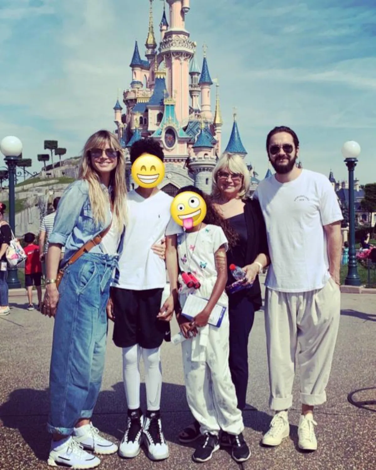 شاركت عارضة الأزياء متابعيها صورة من رحلتها إلى ديزني لاند بباريس، مع خطيبها توم كوليتز، وأطفالها الذين كانت وجوههم مغطاة برموز تعبيرية مبتسمة.