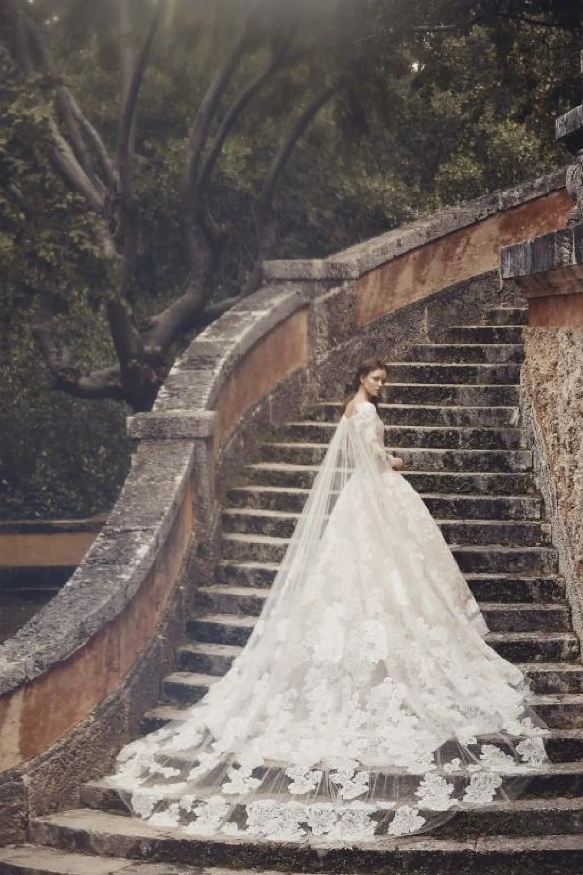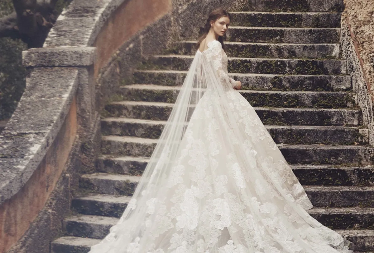 كنوع من الرجوع بالزمن للوراء، اعتمدت دار مونييك لوليير الفستان من التول المنفوش على الأكمام، والكشكش على الرقبة لاطلالة مستوحاة من الثمانينيات، للمسة راقية تجذب كل الأنظار للعروس، بينما يأتي الجزء السفلي للفستان مطرزًا وأنيقًا بالدانتيل مع رسومات الورود.