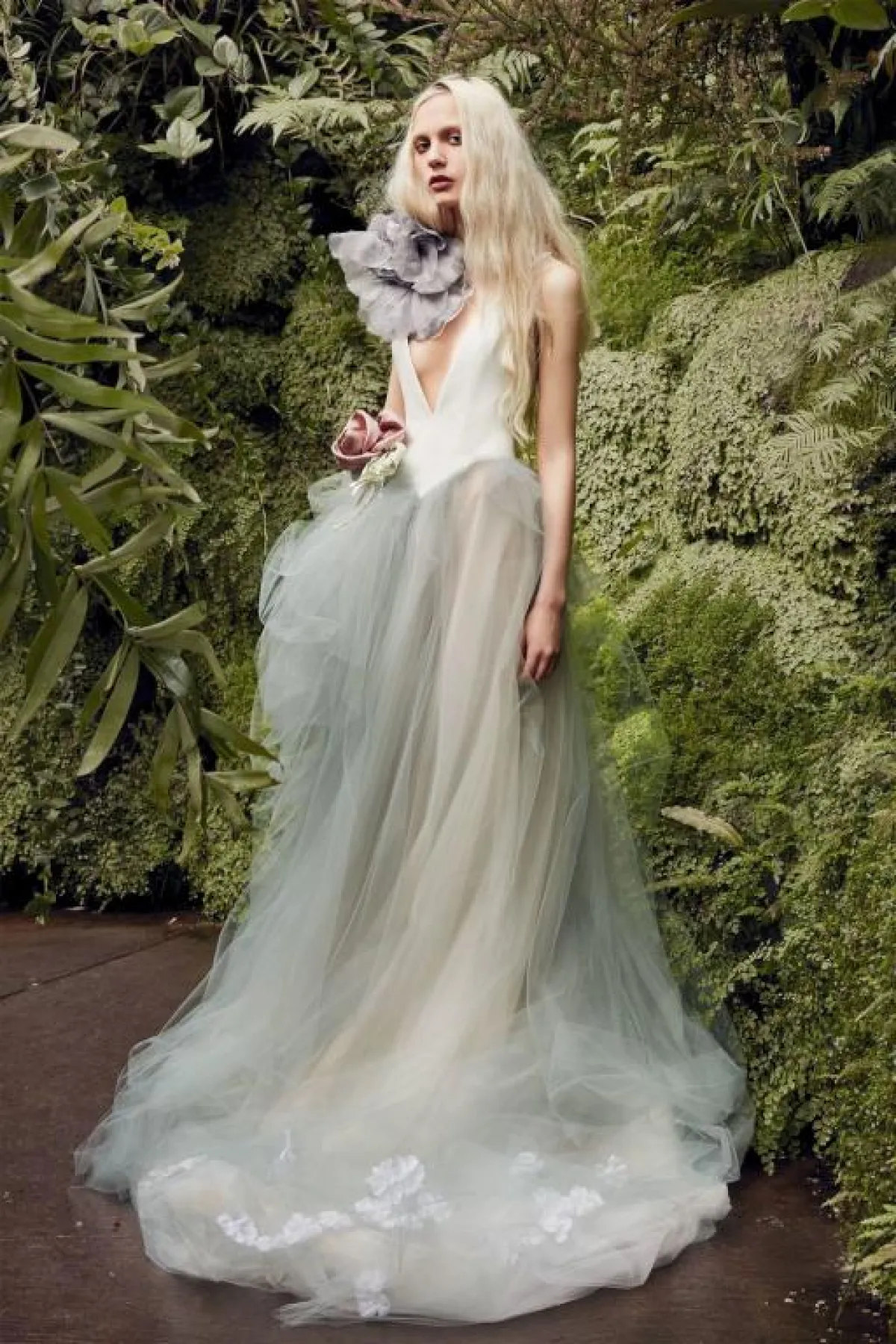 أبدعت دار أزياء فيرا وانغ، باعتماد فساتين زفاف تركز بشكل كبير على التول الملون، يمكنكِ اعتماد أحد هذه الفساتين كإطلالة غير تقليدية بحفل الزفاف، كما أنّ تطريزات الورود كانت كذلك من قصاصات الورود المنفوشة وكبيرة الحجم.
