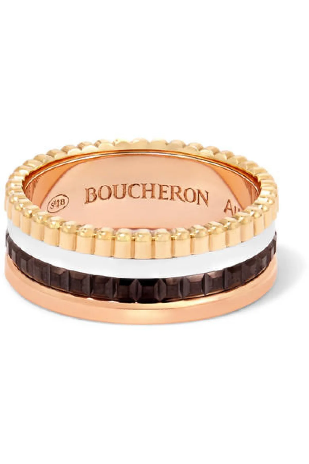 هذه الصيحة برزت بشدة هذا الموسم، واعتمدتها دور مجوهرات عالمية كبرى على رأسهم دار بوشرون التي تدخل في خاتمها الشهيرة، الذهب الأسود، مع الوردي والأصفر والأبيض. أما شوبارد ونور فارس وسليم مزنر وبوميلاتو فابتكروا سلاسل ذهبية مزينة بأحجار من الذهب الأسود ذات تصاميم رائعة وأنثوية جداً. وطبعاً لا يمكن أن ننسى أقراط ايبوليتا المميزة التي تليق بشعر مرفوع لكي تبرز جماليتها.