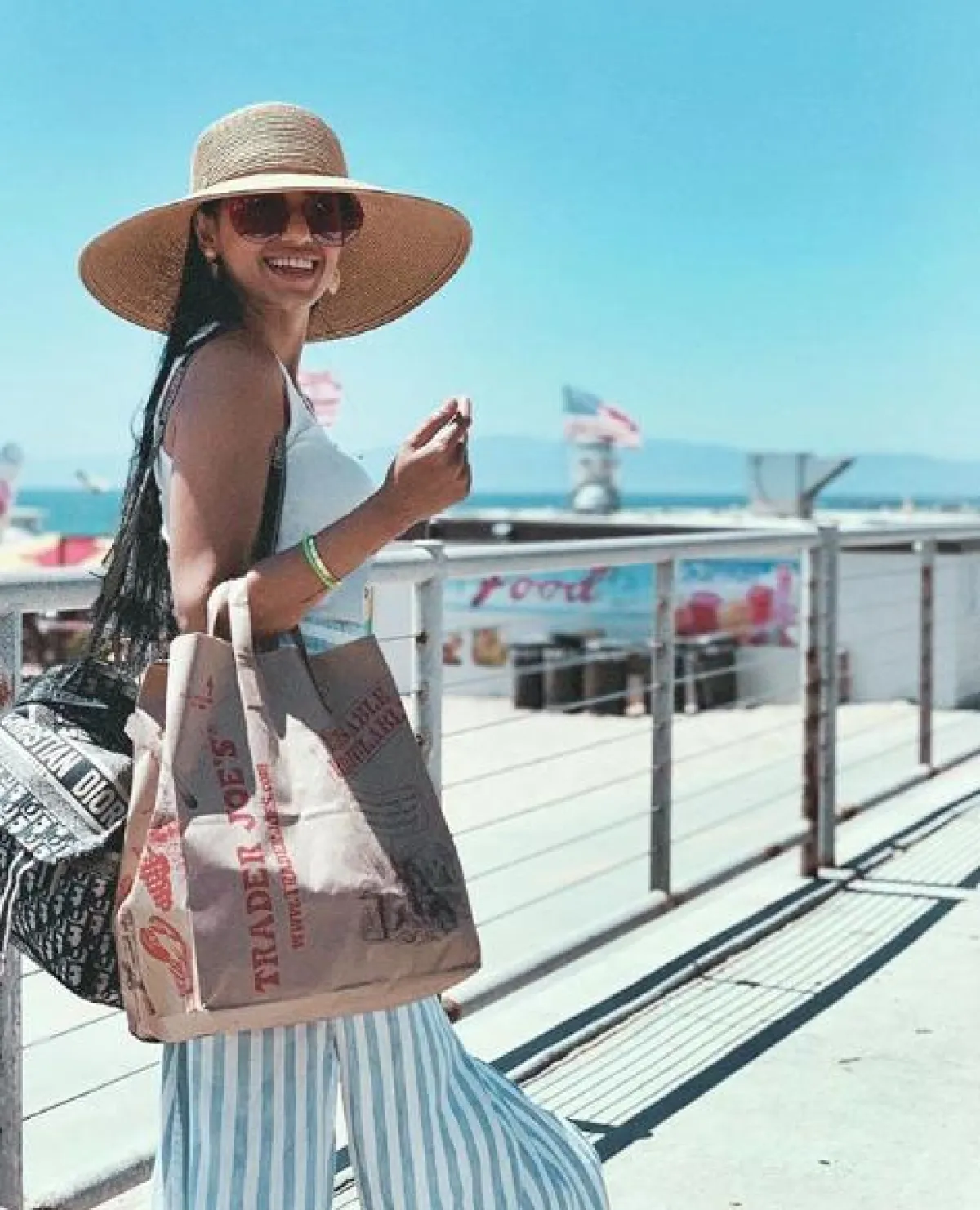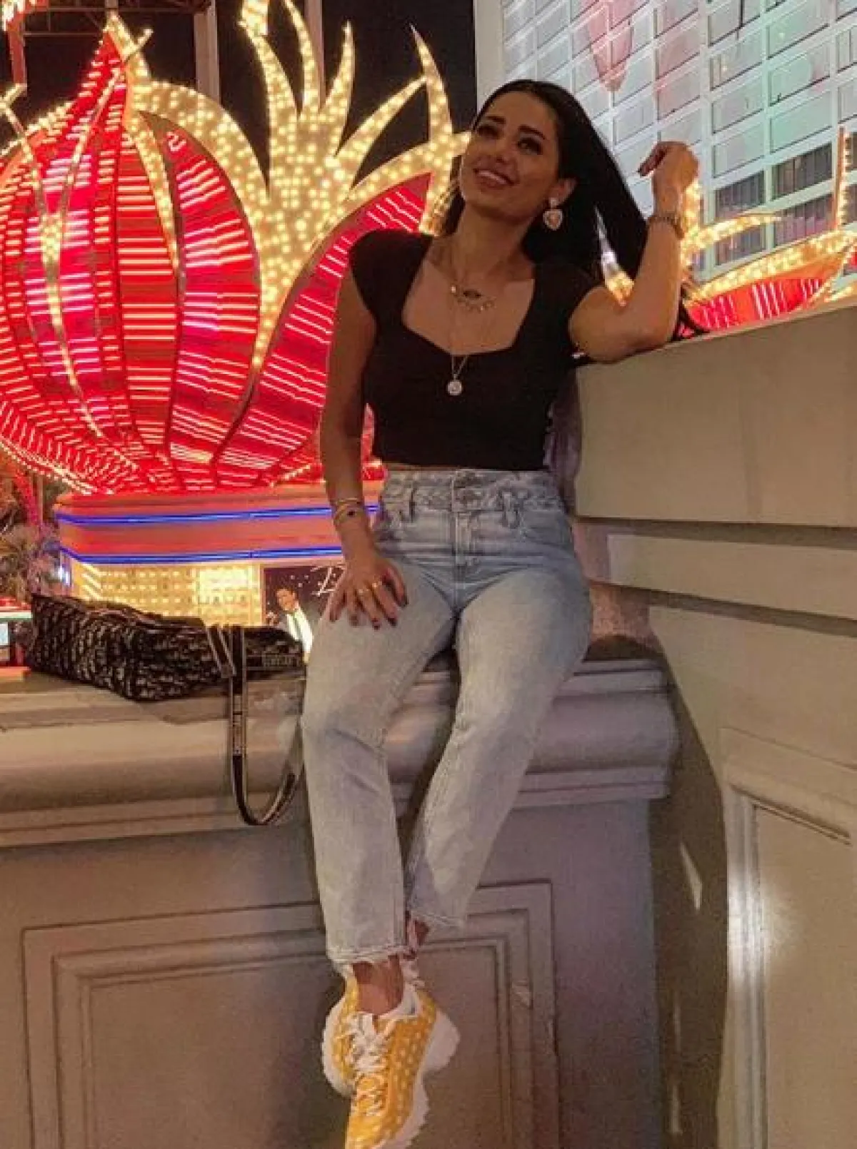 الجينز الخصر العالي اختيار النساء والشابات الأول في هذا الموسم، ولاسيما أنه ينحت الجسم ويجعل القوام يبدو أكثر تناسقاً، وقد شاهدنا رحمة رياض وقد اعتمدته لأحد المشاوير المسائية بأسلوب كاجوال، ونسقت معه توب باللون الأسود وحذاء رياضي أصفر وحقيبة يد كبيرة من “ديور” Dior وأكملت اللوك ببعض المجوهرات الذهبية الناعمة.