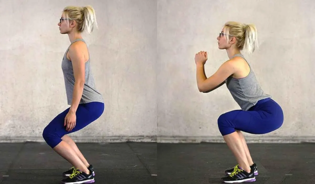 في هذا التمرين، يتمُّ الوقوف باستقامة، مع مدِّ الذراعين بالكامل إلى الأمام، والمباعدة بين الساقين. ثم، تُثنى الركبتان، مع دفع المؤخرة بشكل بارز إلى الخلف، والحفاظ على استقامة الجذع.