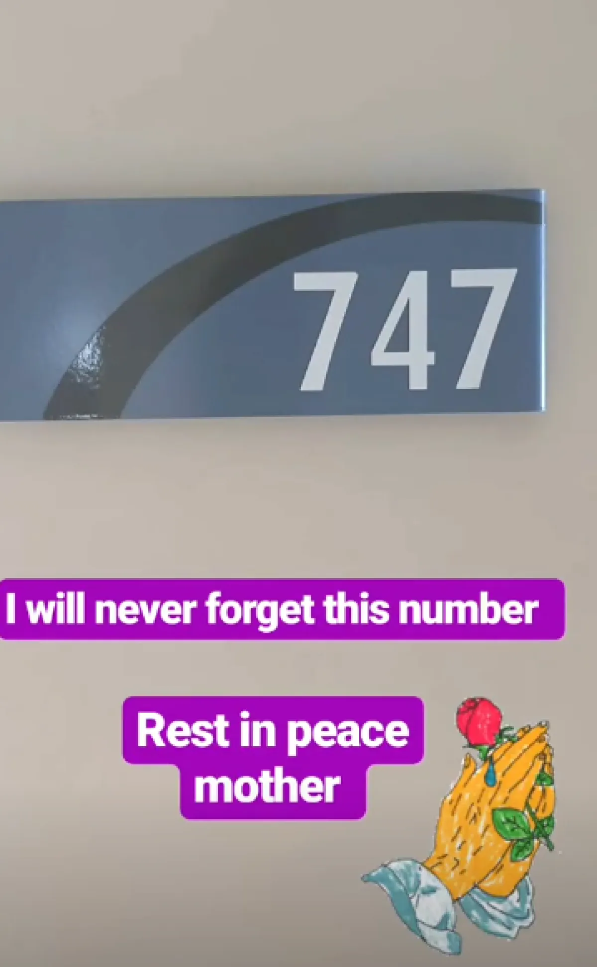 ونشرت كارلا صورة للغرفة التي كانت ترقد فيها والدتها، وتحمل الرقم 747 وعلقت عليها" لن انسى ابداً هذا الرقم. فلترقدي بسلام أمي".