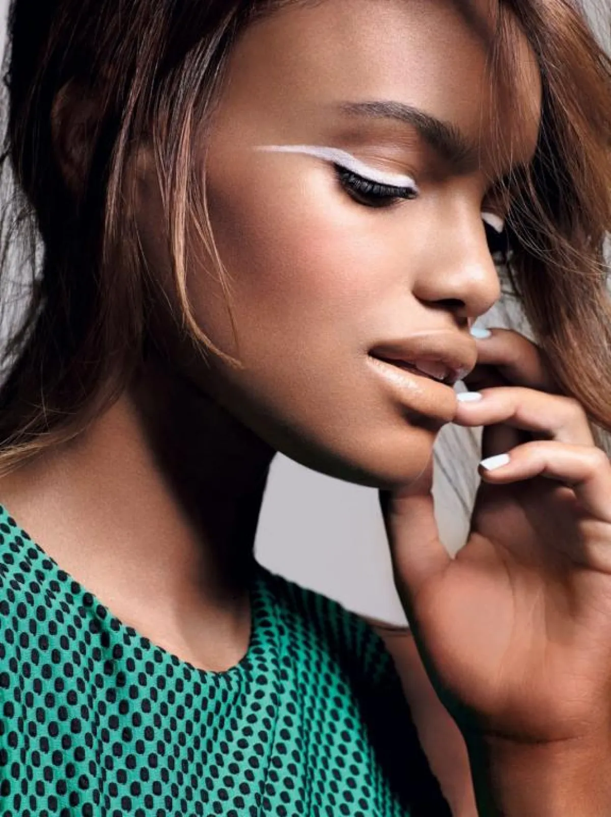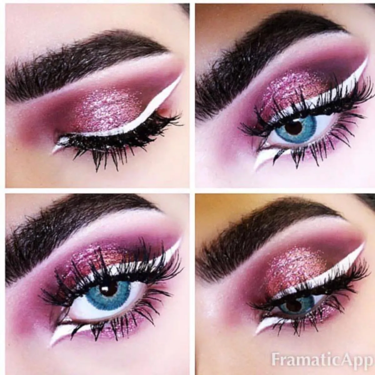 اختاري ظلال العينين التي ترغبين، وابدئي باللون الفاتح ومن ثم انزلي باللون حتى يصبح بدرجة أغمق. ومن ثم ارسمي بعناية خط الأيلاينر الأبيض، سواء اخترتِه رفيعًا أو سميكًا. راعي شكل العينين وحجمهما حين تضعين الأيلاينر.