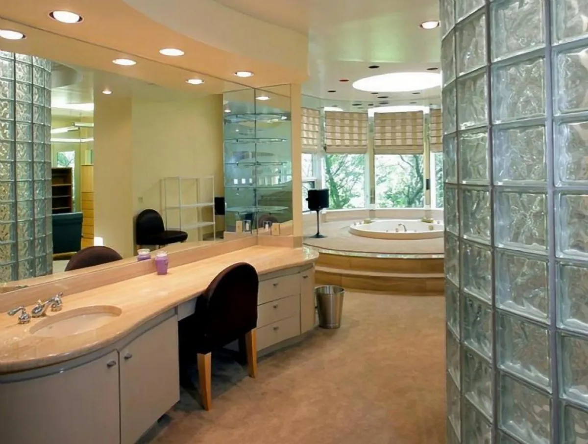 وتحلّ الأناقة على الحمّام الرئيس الفسيح والمُقسّم إلى قسمين:الأول يتضمّن خزانة من الخشب، تحتضن عدداً من الأدراج، وتمتاز بسطحها الرّخام لحوض الغسل، تعلوه مرآة ضخمة؛ والثاني يضمّ حوض الاستحمام المشغول من الرخام الأبيض الذي يقع تحت النوافذ.