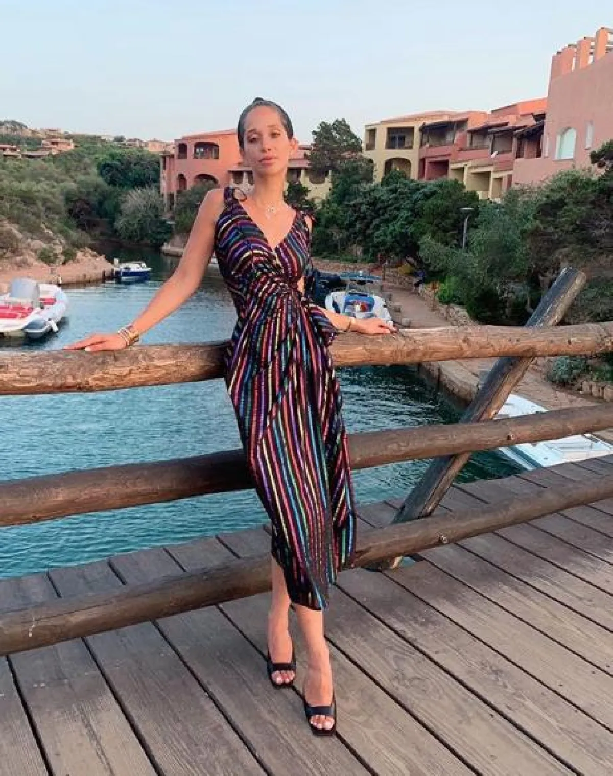 أما مدونة الموضة اللبنانية لانا الساحلي، فقد أمضت إجازة العيد في إيطاليا، وشاهدناها في عدد من الاطلالات اللافتة، ومنها هذه اللوك الذي اختارت فيها فستانًا من دون أكمام مقلّمًا بدرجات الميتالك اللامعة اختارته من “ذا أتيكو” The Attico وقد نسقت معه صندلًا بكعب عالٍ أسود، واكسسوارًا ناعمًا للشعر.