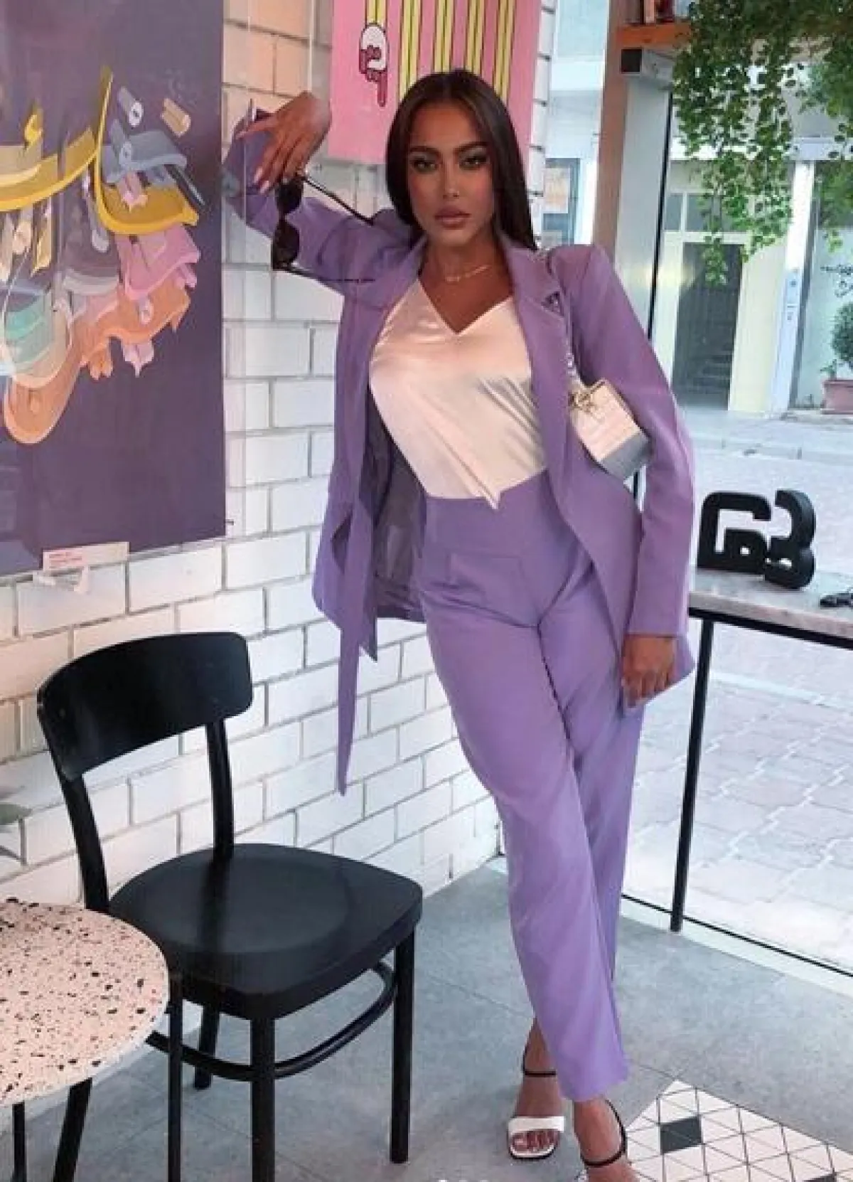 فاطمة المؤمن معروفة بخياراتها العصرية، ومنها هذا اللوك الذي نسقته للعيد، وقد اعتمدت فيه البدلة الرسمية إحدى أبرز صيحات الموضة، وقد اختارتها باللون البنفجسي ونسقت من تحتها توب من الحرير باللون الأبيض، وأكملت الاطلالة بصندل بكعب عالٍ باللونين الأسود والأبيض، وشنطة يد صغيرة بتصميم مبتكر.