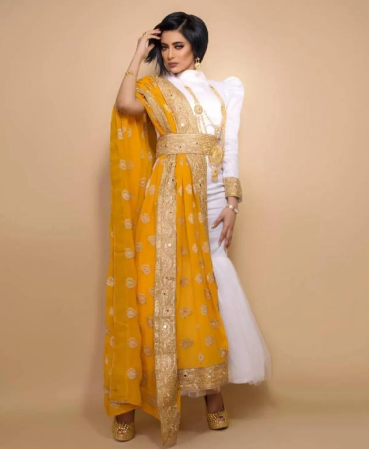 تزينت الفنانة شذى سبت بفستان مصمَّم بدقة بدا في الجهة اليسرى كفستان أبيض حديث بأكمامه المرفوعة وتصميمه الضيق الذي اتَّسَعَ من الأسفل بكشكشة، ومن الجهة اليمنى صُمِّمَ باللون الأصفر الذي يزينه الذهبي بطابع قديم، وربط بينهما حزام ذهبي ضخم، وتألقت بفستان أزرق ضيق بوشاح وحزام يزيِّن خصرها، وبنقشات فضية أشبه بالنقشات القديمة، ولفستان أكثر عراقة ارتدت فستانًا أحمر بقماش أكثر شعبيةً بتصميم منفوش، كما أطلَّت بفستان فوشيا بتصميم شعبي يزينه حزام ذهبي من المنتصف، ووشاح أشبه بالذيل الذي ميَّز الفستان، وظهرت بفستان أبيض من المنتصف وأحمر من الأطراف بتصميم واسع، تزيِّنه اللمعة الذهبية من الحزام والأطراف ليبدو في غاية الأناقة، وفي إطلالة أخيرة تزينت بفستان أسود بكشكشة من الأسفل، يزينه اللون الذهبي لتصميم أكثر تميزًا.
