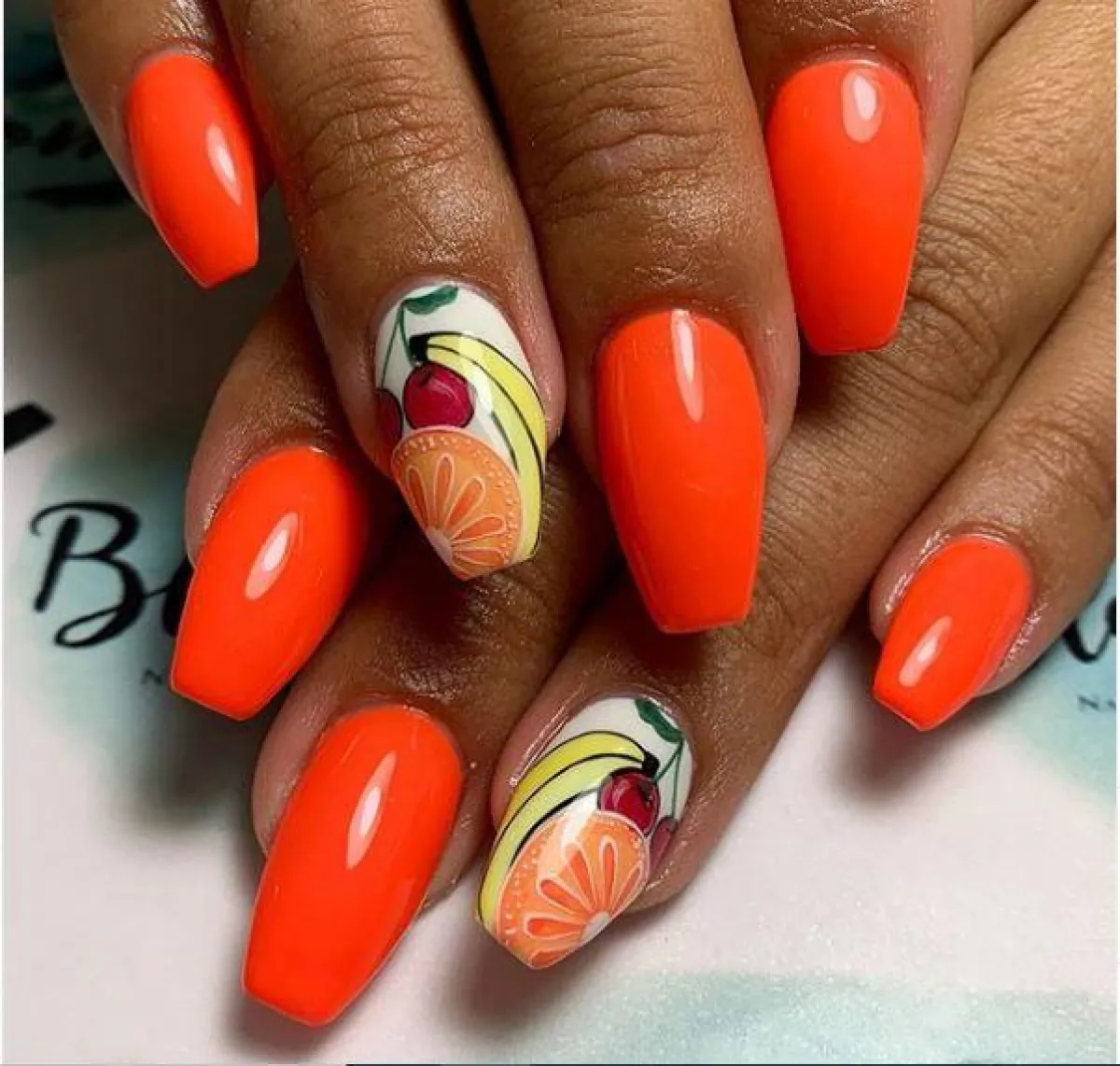 مناكير الفاكهة مع خلفية نابضة: في هذا النموذج، تمّ تزيين أعلى الظفر بنصف حبة فاكهة على هيئة قمر. فيما زّين باقي الظفر بالمناكير البرتقالي اللماع الذي يعكس اجواء الديسكو.