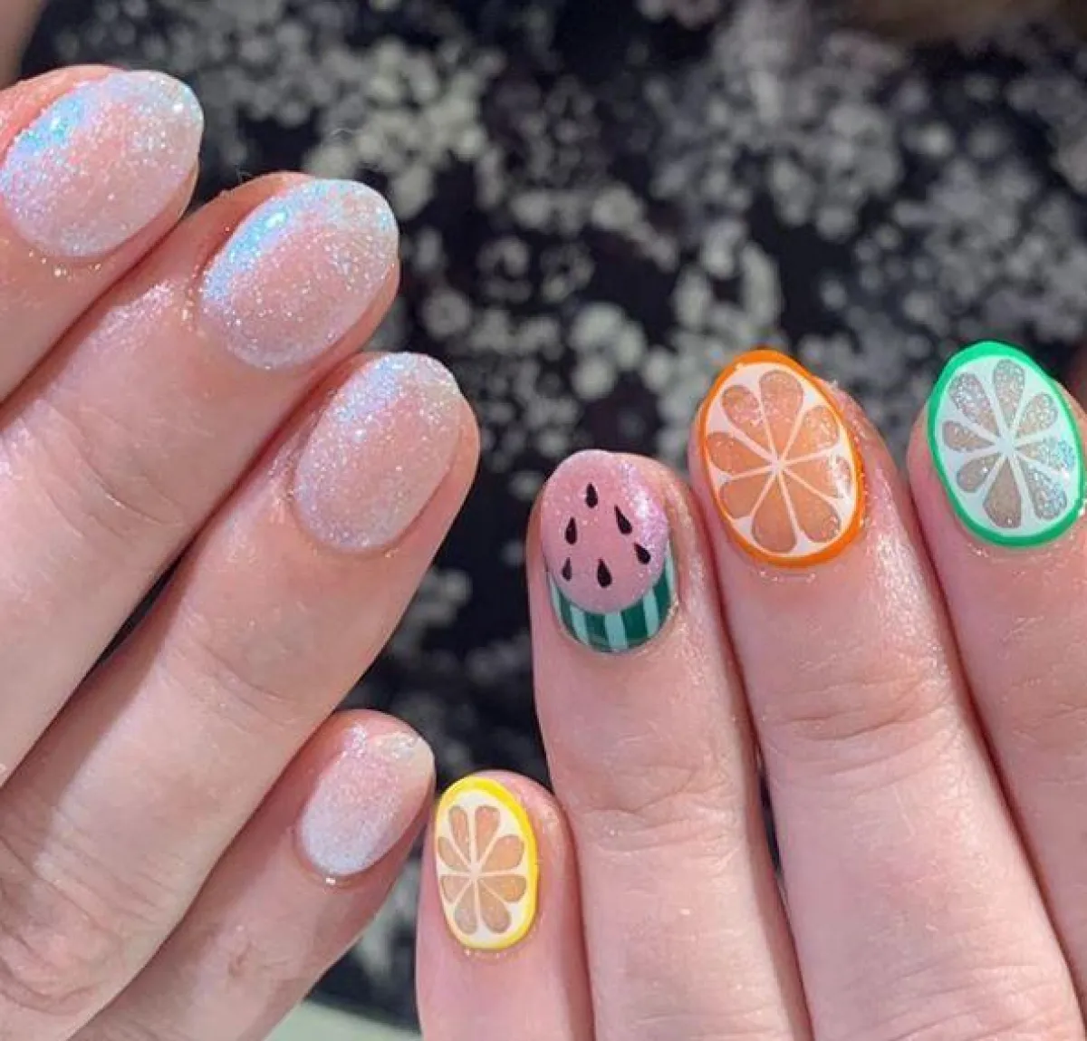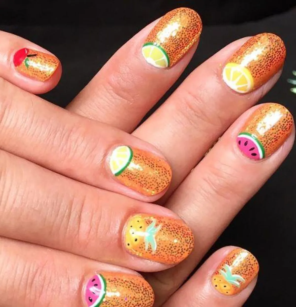 الفاكهة المثلّجة: يمكن إضافة مسة مرحة الى اظافرك عبر وضع طبق من المناكير الغليتر فوق حبات الفاكهة لاضفاء احساس بالجليد وسط درجات الحرارة المرتفعة.