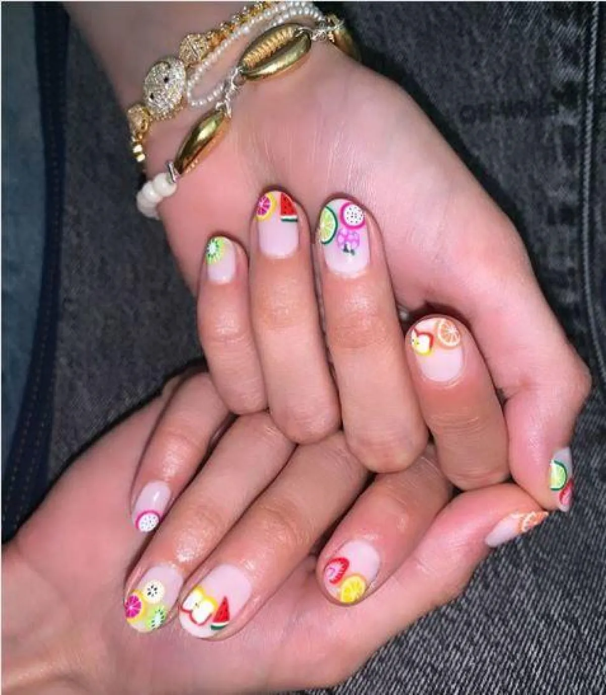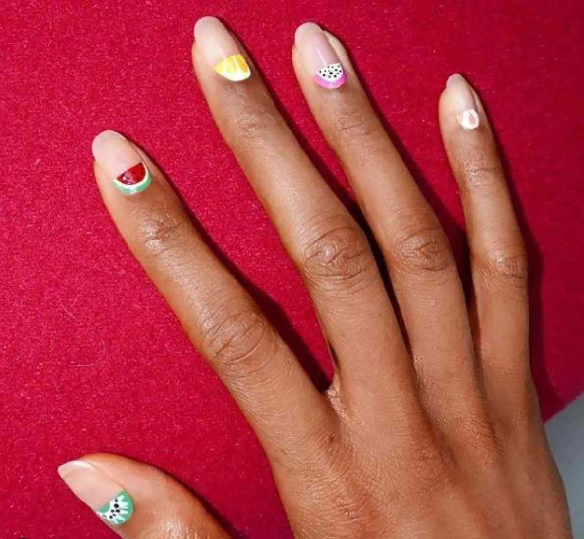 الفاكهة واحدها: إذا كنت من محبّات المناكير المينيماليست، يمكن ان تطبّقي رسوم الفاكهة على أعلى الظفر فقط، مع ترك الظفر شفافا اي من دون اي طلاء أظافر ملون.