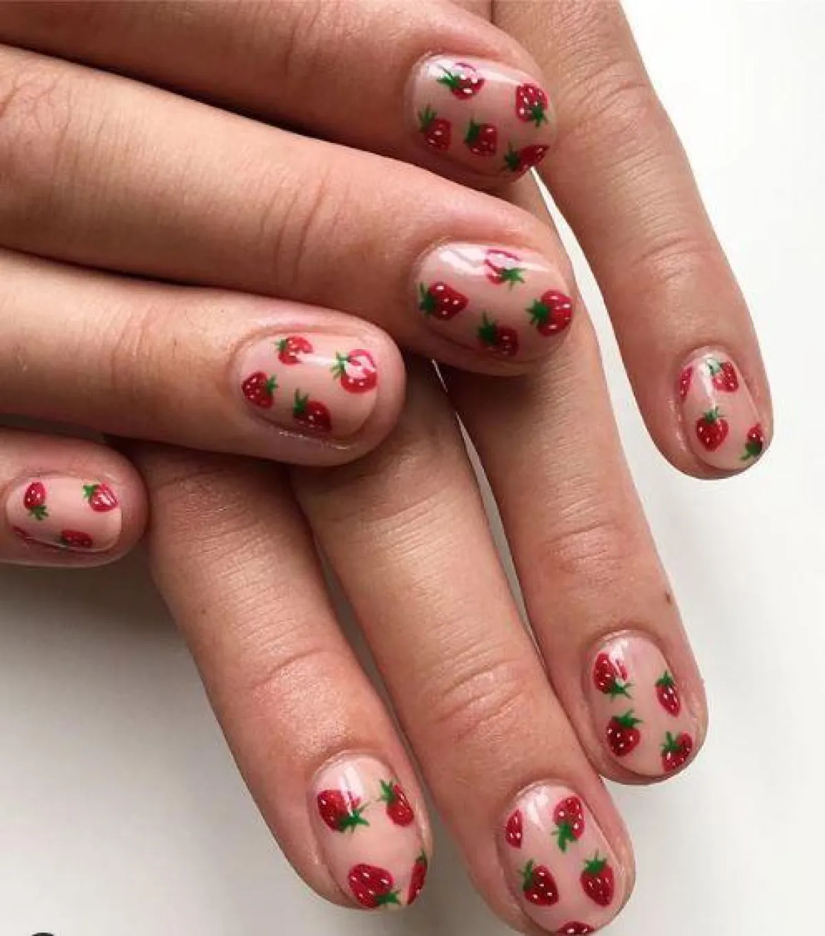 على أظافر شفافة يمكن رسم حبات من الفراولة الحمراء للحصول على مناكير صيفي بسيط ورائع في الوقت نفسه.