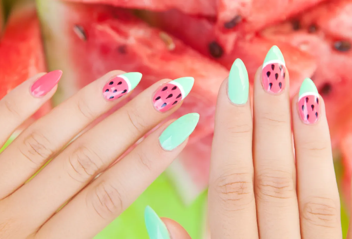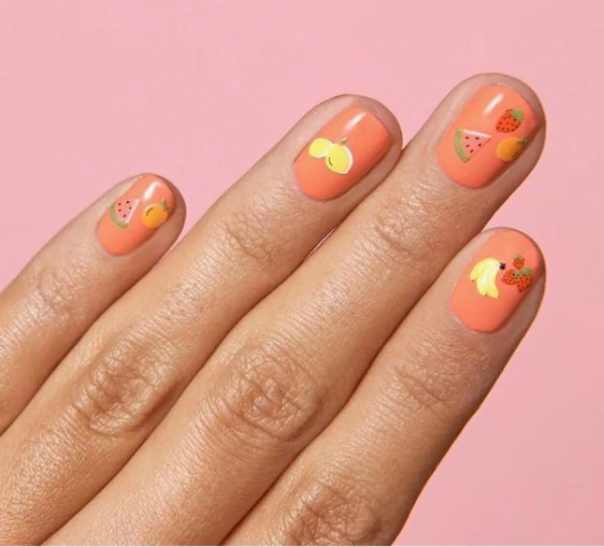 ستيكرز الفاكهة: إذا كان رسم الفاكهة ليس من هواياتك، يمكن ان تطبقي لون مناكير أحادي اللون ثم زيّنيه بستيكرز بأشكال الفاكهة بعدها ضعي طبقة من الـ"Top Coat".