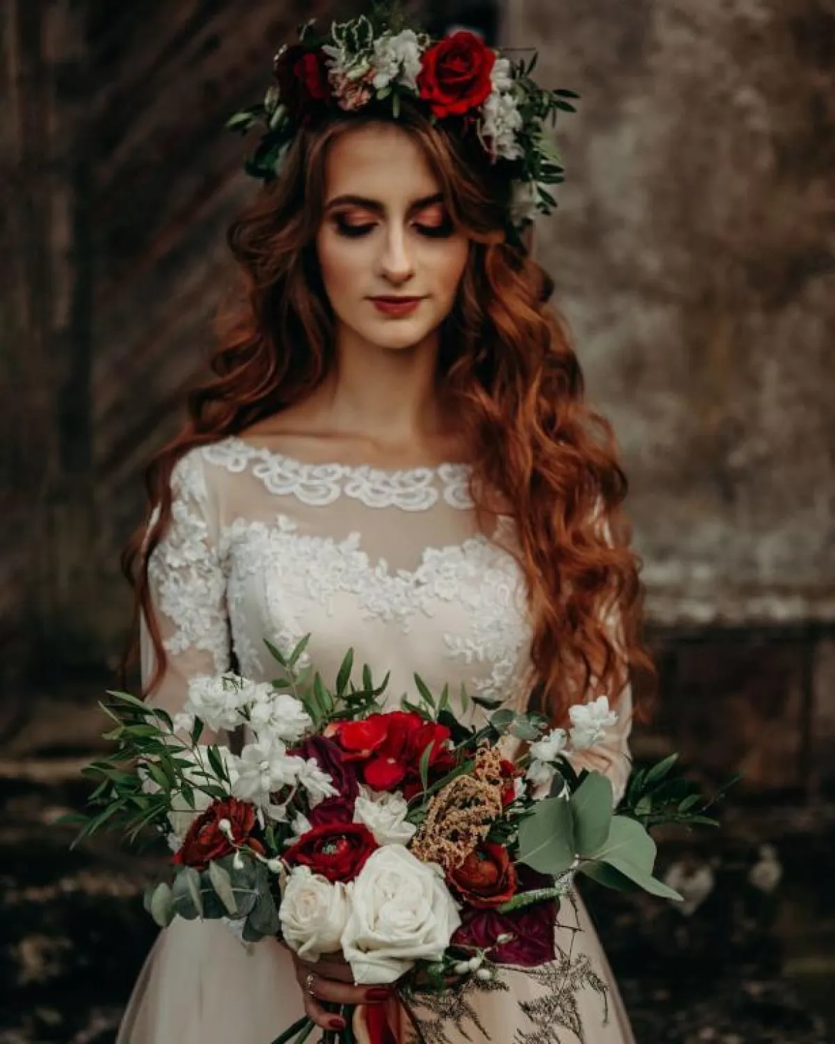 يبدو أن الإطلالات البوهيمية للعروس سوف تسيطر على عالم الموضة بشكل كبير هذا الموسم، ومع فستانك البوهيمي، لما لا تفكرين بتسريحة الشعر الويفي، مع تاج الورود الملون الفخم، وستكون هذه التسريحة مثالية خاصة مع شعرك المصبوغ.