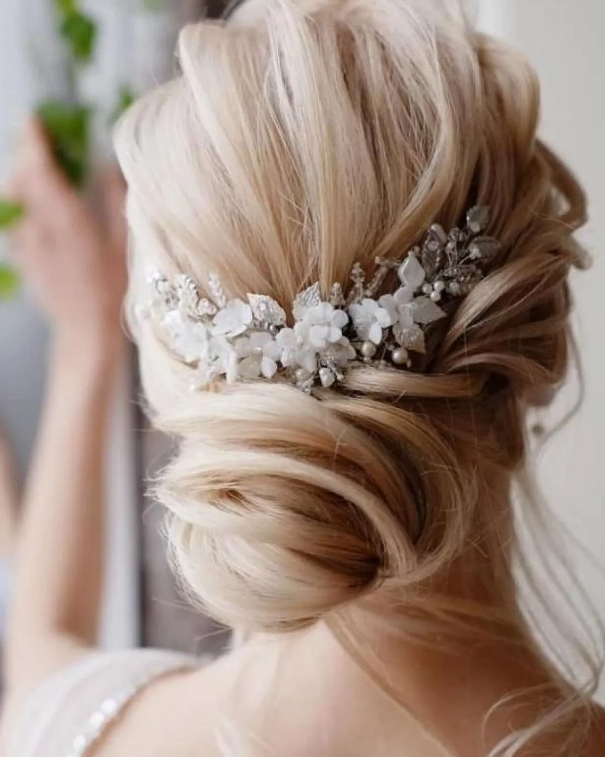 من الصيحات التي لا يمكن الاستغناء عنها بتسريحات شعر العروس هو تسريحة الشعر الملفوف، يمكنك اعتمادها بخريف 2019، مع صيحة الشعر الملفوف، وإكسسوار بسيط من الورود، أو طبقي معه التاج متوسط الحجم.
