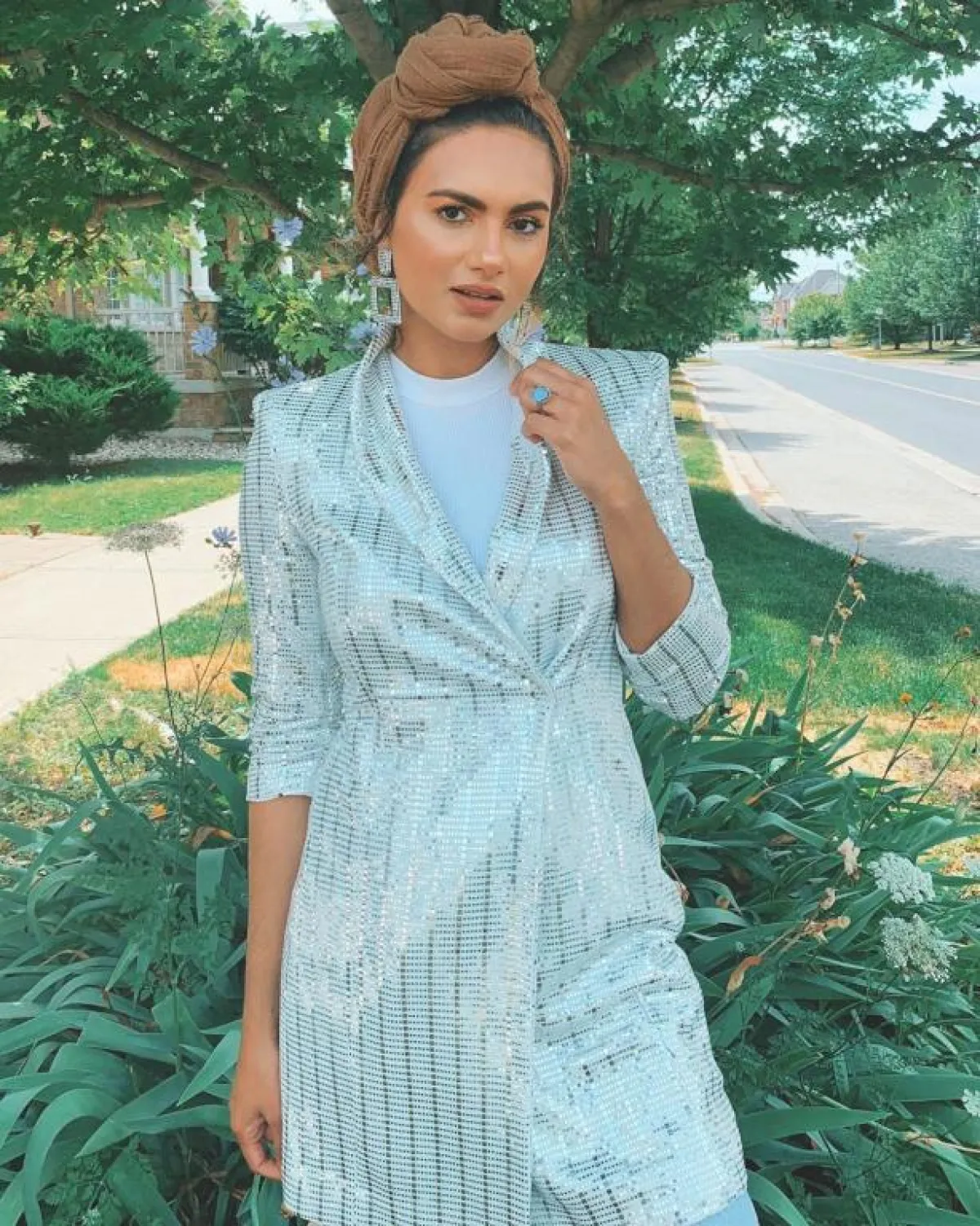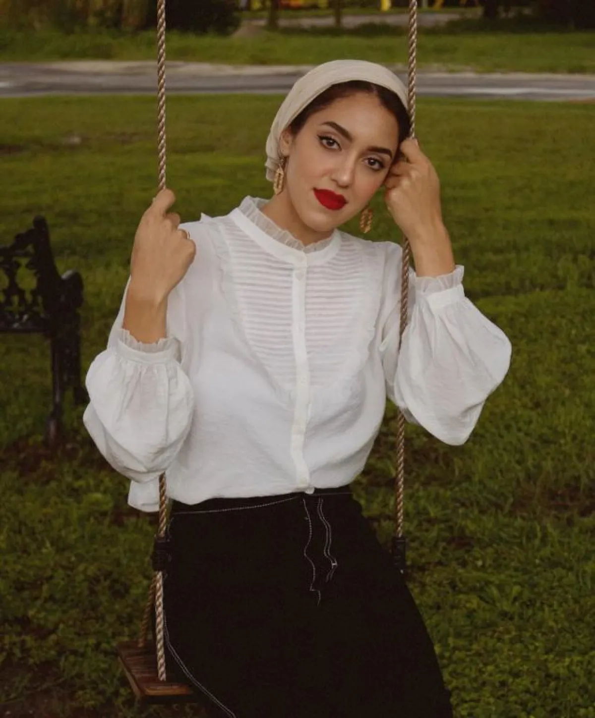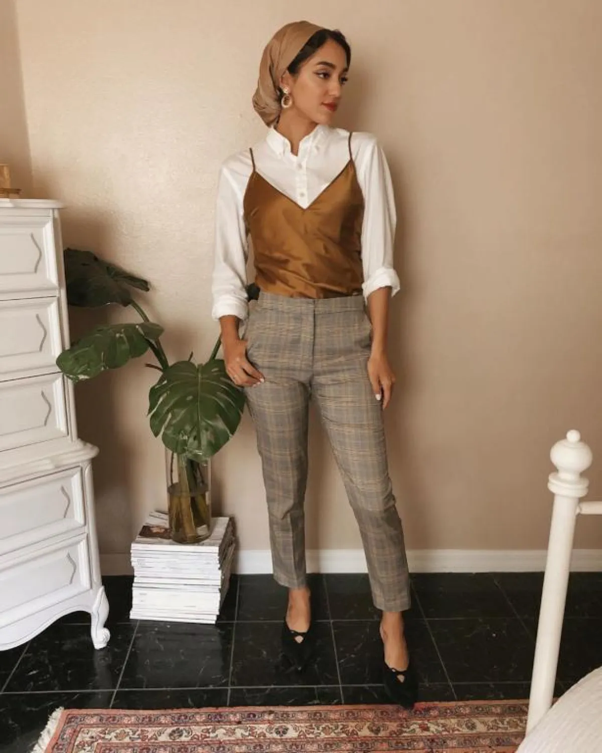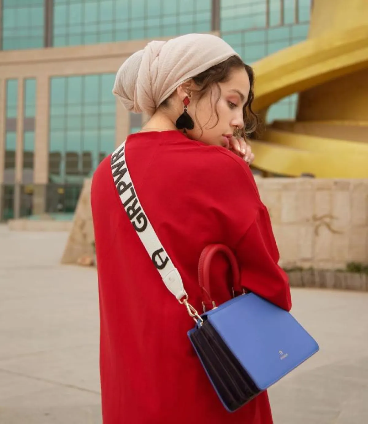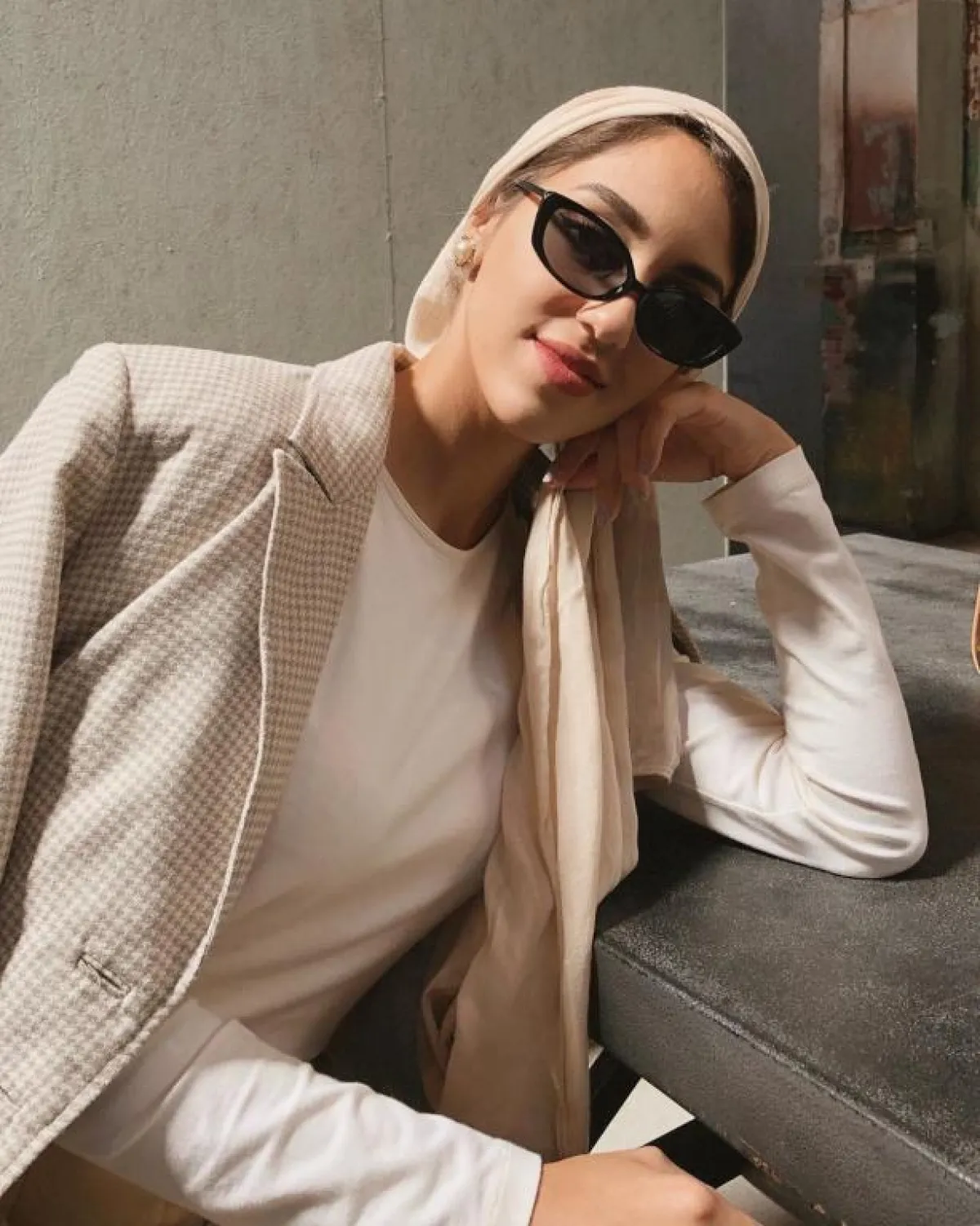 يمكنكِ اعتماد لفة الحجاب السكارف من الساتان الناعمة، لاطلالة بسيطة ومريحة، مع لمسة من أقراط الأذن الميتالك، كهذا الذي اعتمدته مدونة الموضة ماريا عليا باللون الذهبي، والمميز بهذه الأقراط، أنها لم تعد مرتبطة بأوقات المساء، بل يمكنكِ اعتمادها بكل ثقة في النهار أيضًا.