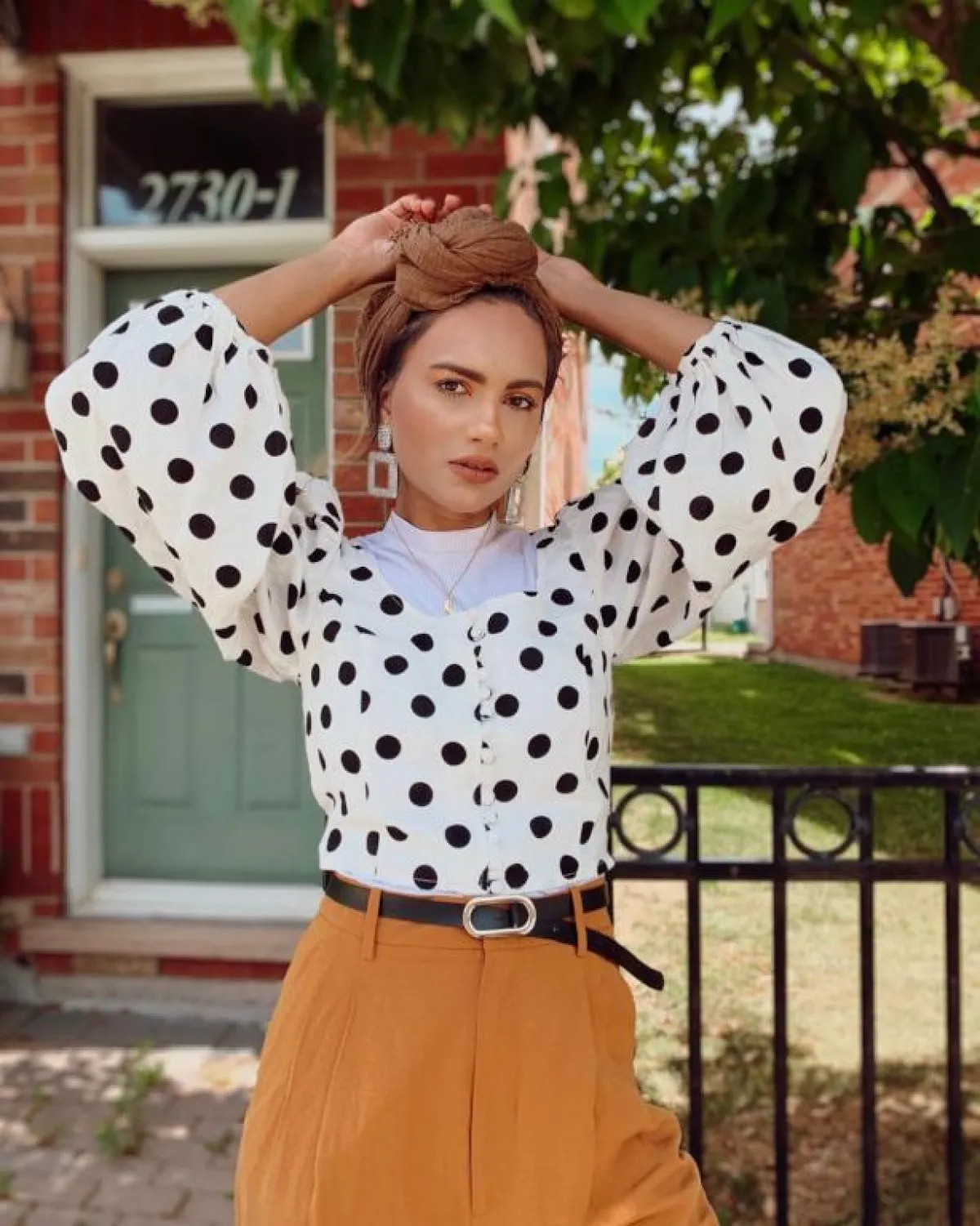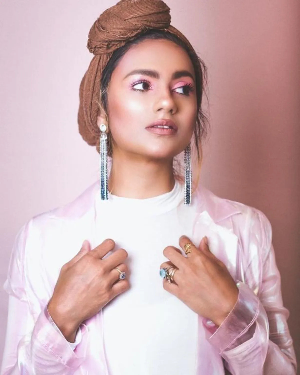 عادت موضة أقراط الأذن المدورة بشكل كبير هذا الموسم، وهي من الاكسسوارات التي برزت في فترة الثمانينيات، من الممكن أن تعتمديها مع حجاب التوربان، بخاصة للصبايا صاحبات الوجه الطويل والنحيف، كهذه الاطلالة من الفاشينيستا سارة صبري.