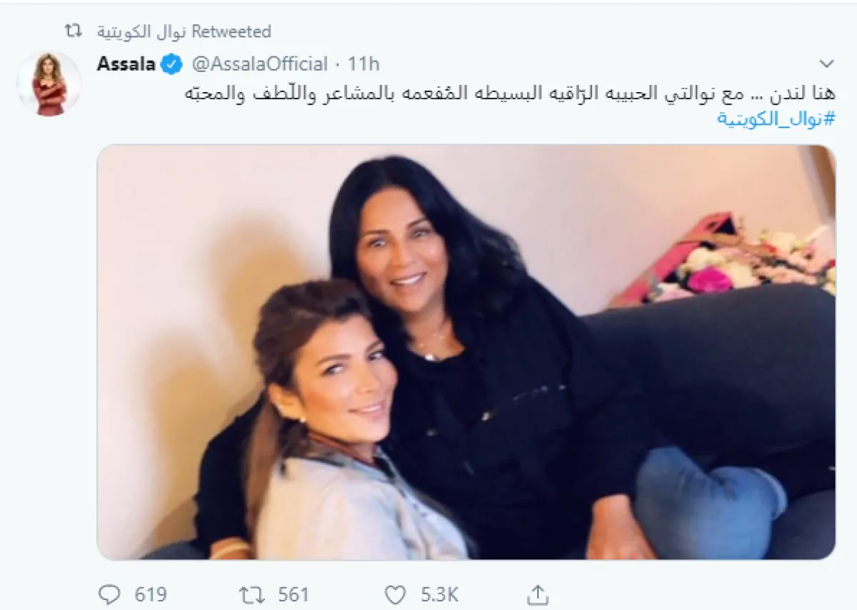 أصالة المتواجدة حاليا في لندن جمعتها المصادفة باللقاء معر المطربة نوال الكويتية وقامت بالتقاط صورة عفوية معها داخل المنزل وعلقت عليها عبر حسابها بموقع تويتر قائلة: هنا لندن ... مع نوالتي الحبيبه الرّاقيه البسيطه المُفعمه بالمشاعر واللّطف والمحبّه نوال_الكويتية، وقامت الأخير بإعادة تغريد الصورة مع كلمات أصالة دون وضع أية تعليقات عليها.