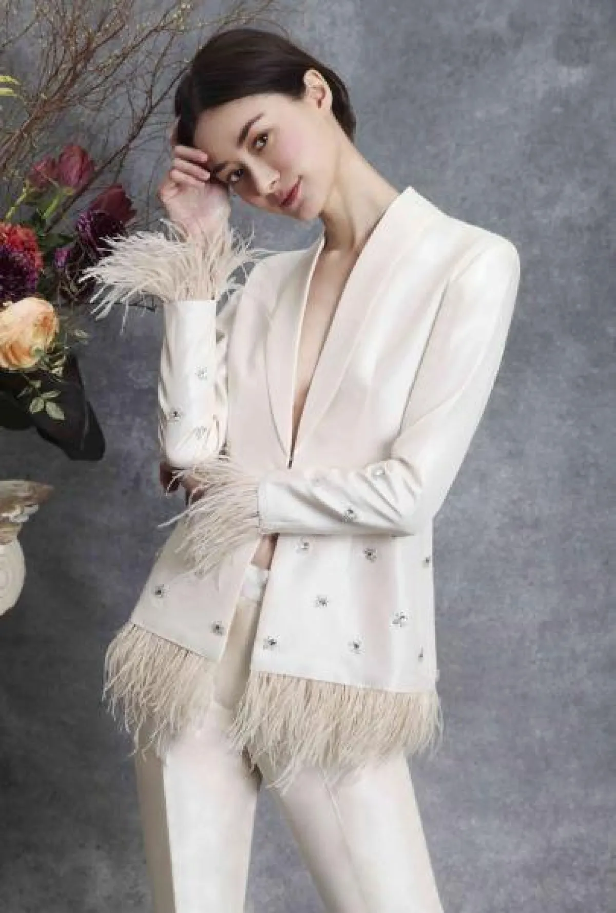 أيضاً قدمت ماركة Sahroo تصميم أنيق وعصري، يجمع بين السروال والبليزر المزين بلمسات برّاقة وريش على الأطراف.