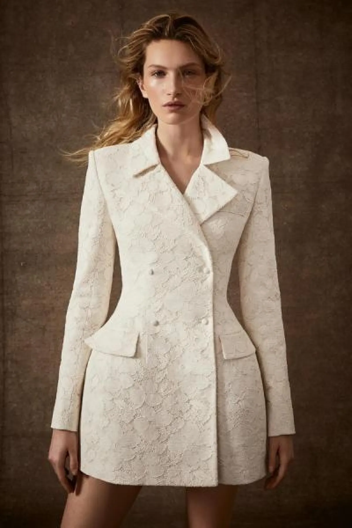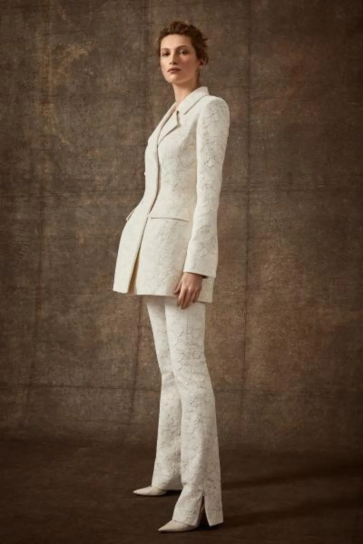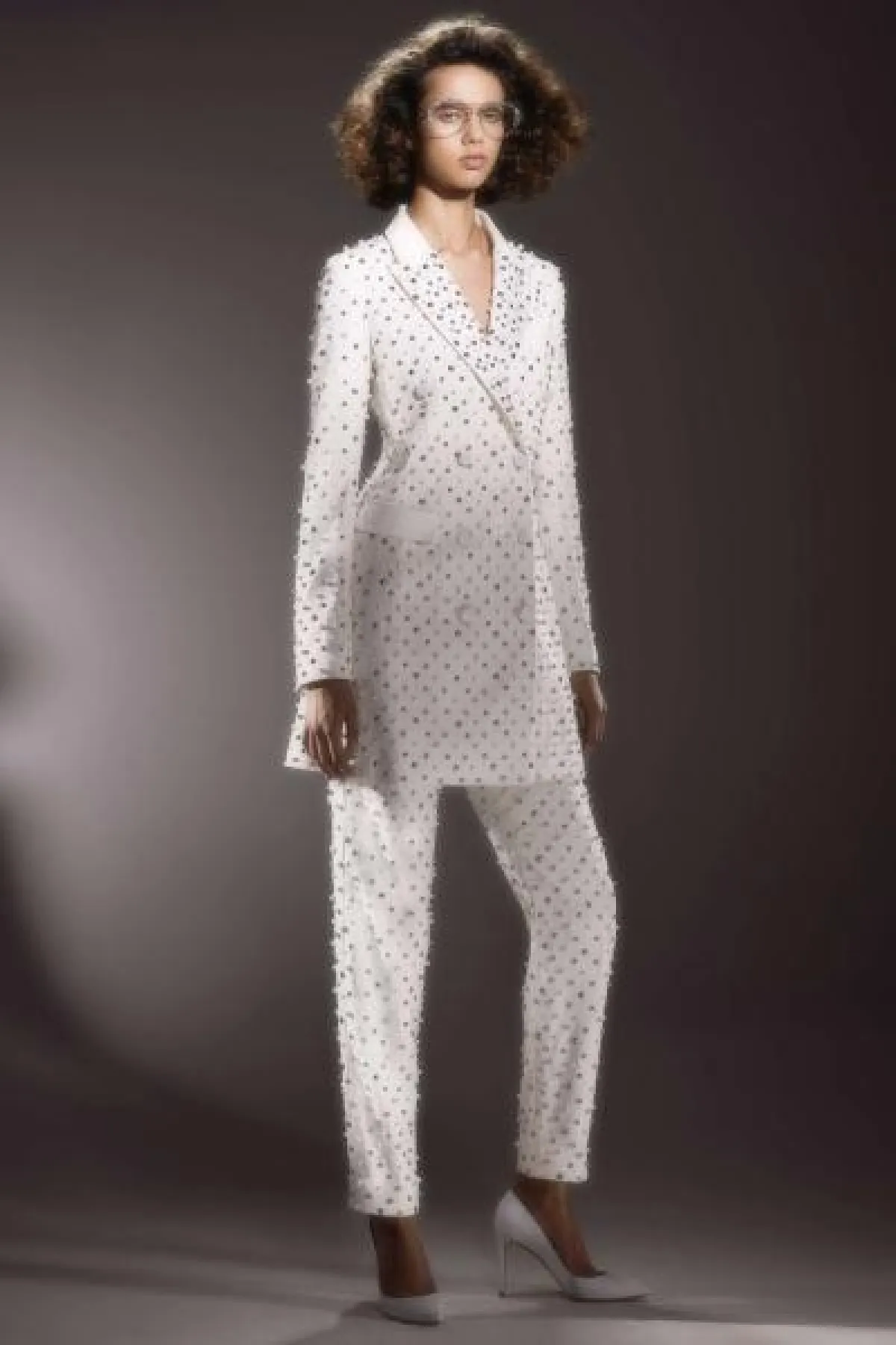 تتألف البدلة من بليزر طويل وسروال بقصّة بسيطة، ومزين باكسسوارات معدنية مدببة.