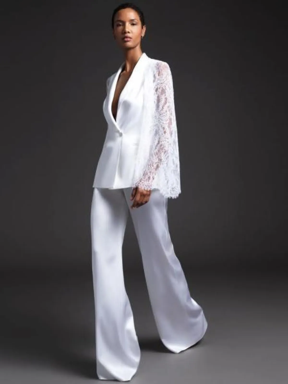 تتسم بدلة Cushnie بالرقي والأنوثة، حيث أنها بالقماش الحريري وبتصميم واسع مع أكمام دانتيل واسعة بصيحة الكاب الرائجة.
