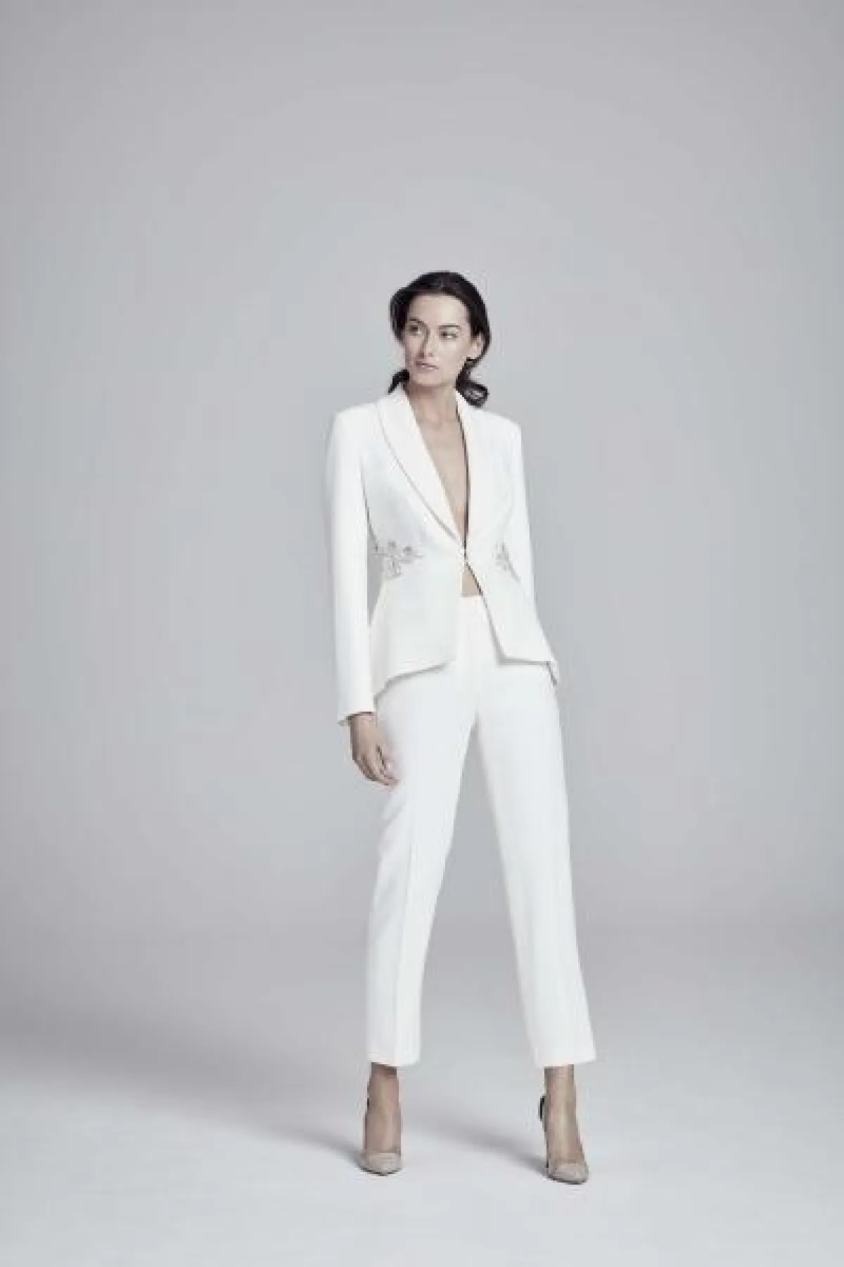 أحببنا بدلة Suzanne Neville العصرية والناعمة بالسروال الذي يصل للكاحل، والبليزر الذي يكشف البطن مع لمسات التطريزات على الجانبين.