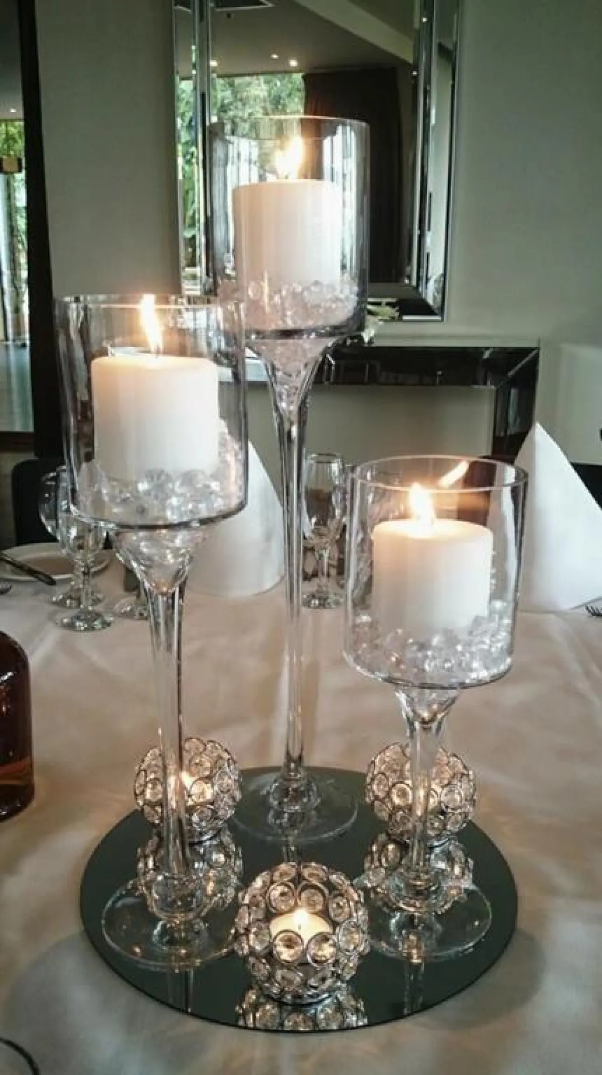 من الممكن أن تعتمدينها بكاسات زجاجية مختلفة الأحجام، ويفضل أن تكون رفيعة قدر الإمكان، واختاري الطويل جدًّا منها، حتى لا تكون عائقًا بين الأفراد الذين يجلسون مقابل بعضهم البعض، بالإضافة إلى طول آخر منخفض للفكرة نفسها.