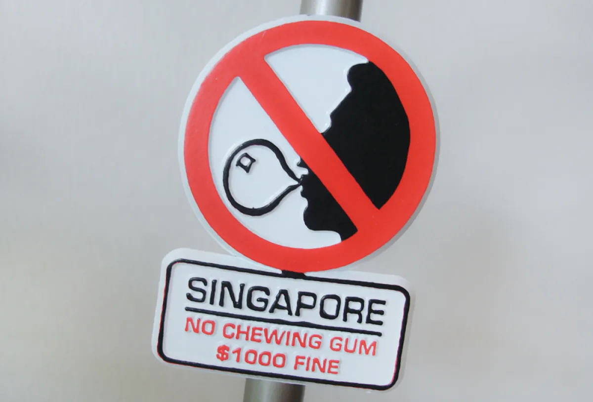 من المعروف أن مضغ العلكة يعاقب عليه القانون في سنغافورة، حيث تفرض الحكومة غرامة قد تصل إلى ألف دولار أميركي لانتهاك هذا القانون، ويرجع تاريخ هذا القانون إلى عام 1992، حيث تسببت علكة قام بإلصاقها أحد الركاب في إعاقة عمل جهاز فتح، وغلق أبواب إحدى عربات مترو سنغافورة.