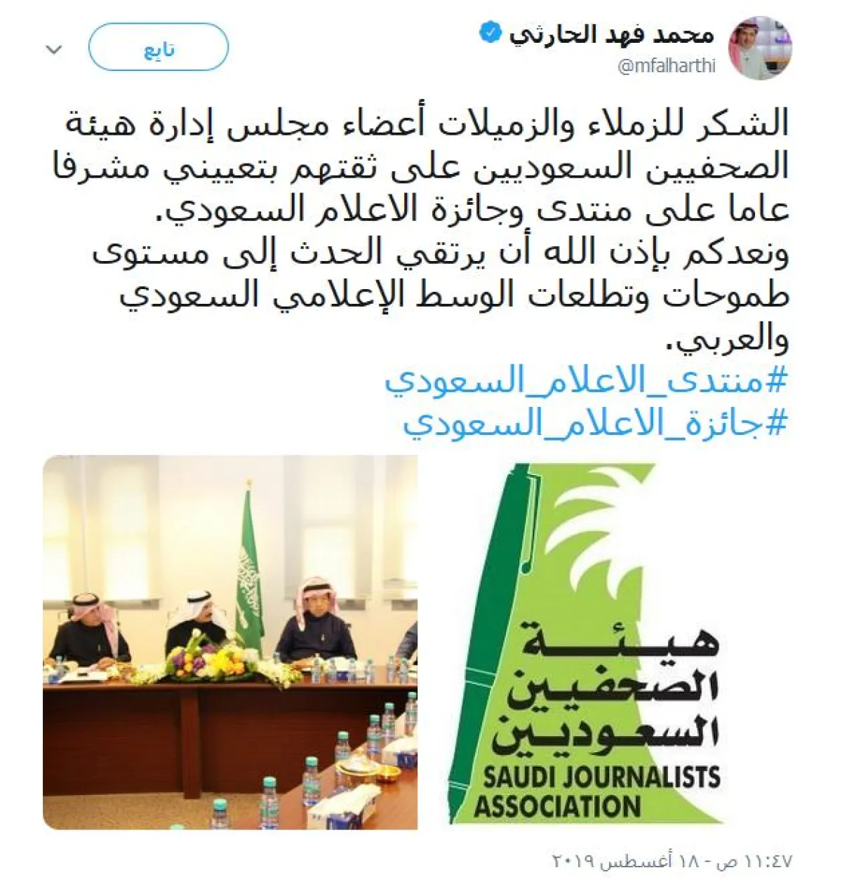 وقال في تغريدته: "الشكر للزملاء والزميلات أعضاء مجلس إدارة هيئة الصحافيين السعوديين على ثقتهم بتعييني مشرفًا عامًّا على منتدى وجائزة الإعلام السعودي، ونعدكم بإذن الله أن يرتقي الحدث إلى مستوى طموحات وتطلعات الوسط الإعلامي السعودي والعربي".