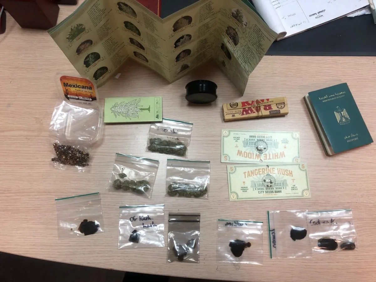 وأضافت المصادر أنه بفتح إحدى الحقائب التابعة للراكب عثر على كيس شفاف به قطعة من مخدر الحشيش في حقيبة يد صغيرة داخل إحدى حقائبه، وبالعرض على الدكتور ماجد موسى، مدير الجمرك، وطارق محمد محمود مدير الإدارة الرابعة، أمرا بتفتيش جميع حقائب الراكب، وعثر على كميات أخرى من مخدر الحشيش داخل 5 أكياس أخرى، و3 أكياس من مخدر الماريجوانا وكارتين بهما 10 بذور من نفس المخدر والكاتالوج الخاص بزراعتهم وكذلك علبة بلاستيك بداخلها قطعة من فطر المشروم المخدر وعبوتين من أوراق البفرة ومطحنة مخدرات داخل جيوب وأحذية الراكب بالحقائب.