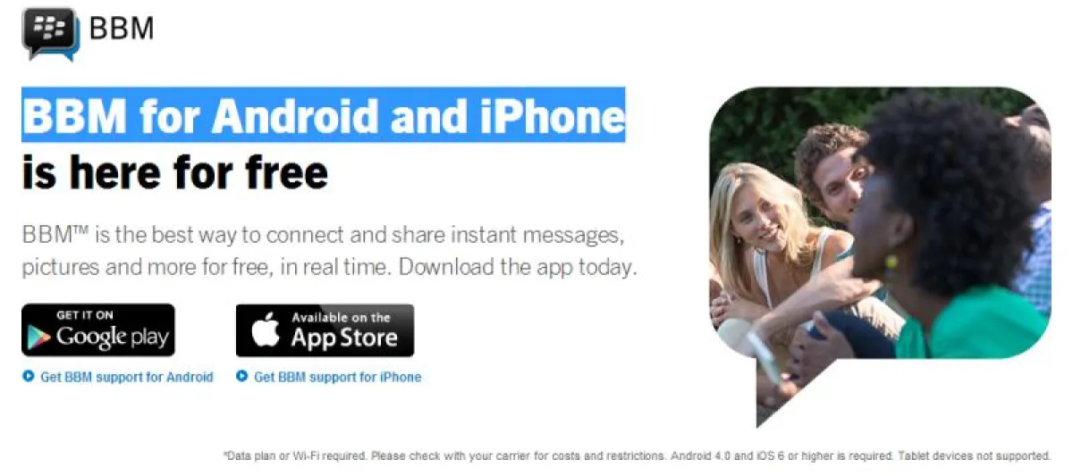 وأصبح تطبيق التراسل الفوري التابع للشركة الكندية متوافراً على متجر "جوجل بلاي" (Google Play) لنظام "أندرويد"، ومتجر التطبيقات "آب ستور" (App Store) لأجهزة "آيفون"، وفي متاجر تطبيقات مختارة تابعة لشركة "سامسونج" الكورية الجنوبية.