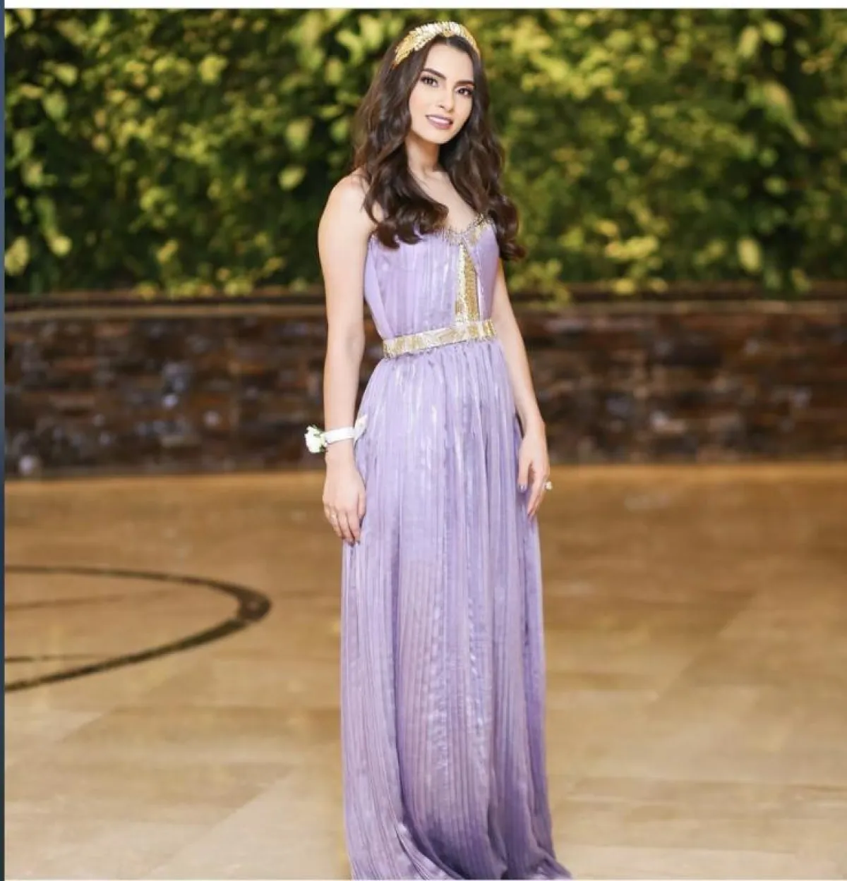 تميل كارمن سليمان لاختيار الألوان الزاهية والدرجات اللونية الناعمة، ولا سيّما في فصل الصيف، مثل هذه الاطلالة التي استوحتها من ملكات الإغريق، وقد اختارت فيها فستان بليسيه باللون البنفسجي الفاتح، دخله اللون الذهبي عند منطقة الصدر وعلى حزام الخصر، وقد نسقته مع اكسسوار ذهبي على الرأس أيضًا، وبدت ناعمة ومشرقة.