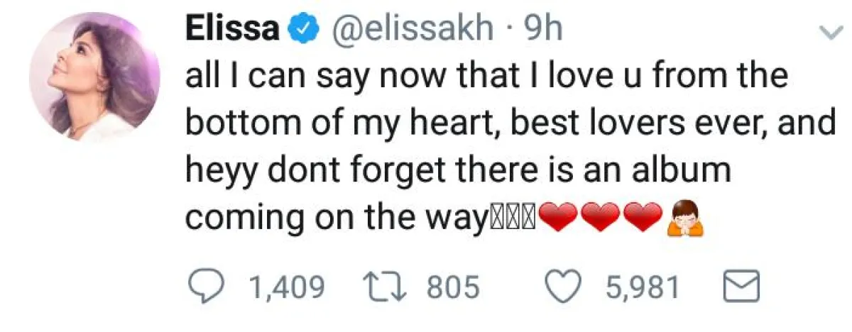 في أول تغريدة لها، بعد إعلانها بأنها سوف تعتزل الغناء، وأنّ الألبوم الذي تحضره حالياً سيكون الأخير لها، أطلت إليسا عبر "تويتر" في منتصف الليل، وكتبت " كل ما يمكنني قوله الآن هو أنني أحبكم من أعماق قلبي.لا تنسوا أن هناك ألبوماً جديداً".