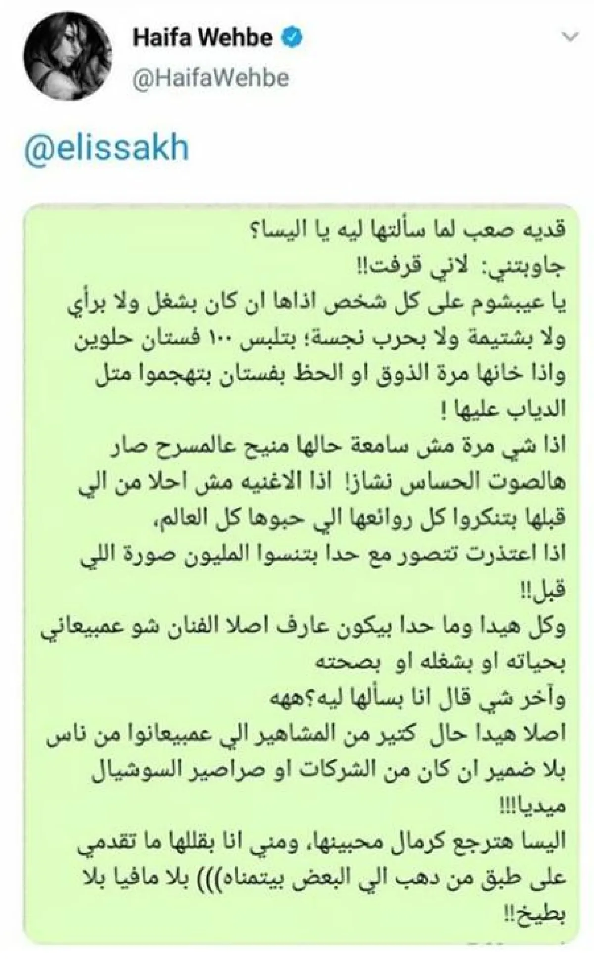 وكشفت هيفاء على "تويتر" أنّ إليسا قالت لها كلاماً يوجع القلب، ما جعلها تكتب مجدداً على "تويتر" بأن إليسا تعرضت للأذى من أشخاص شتموها وحاربوها بآرائهم وفي العمل.