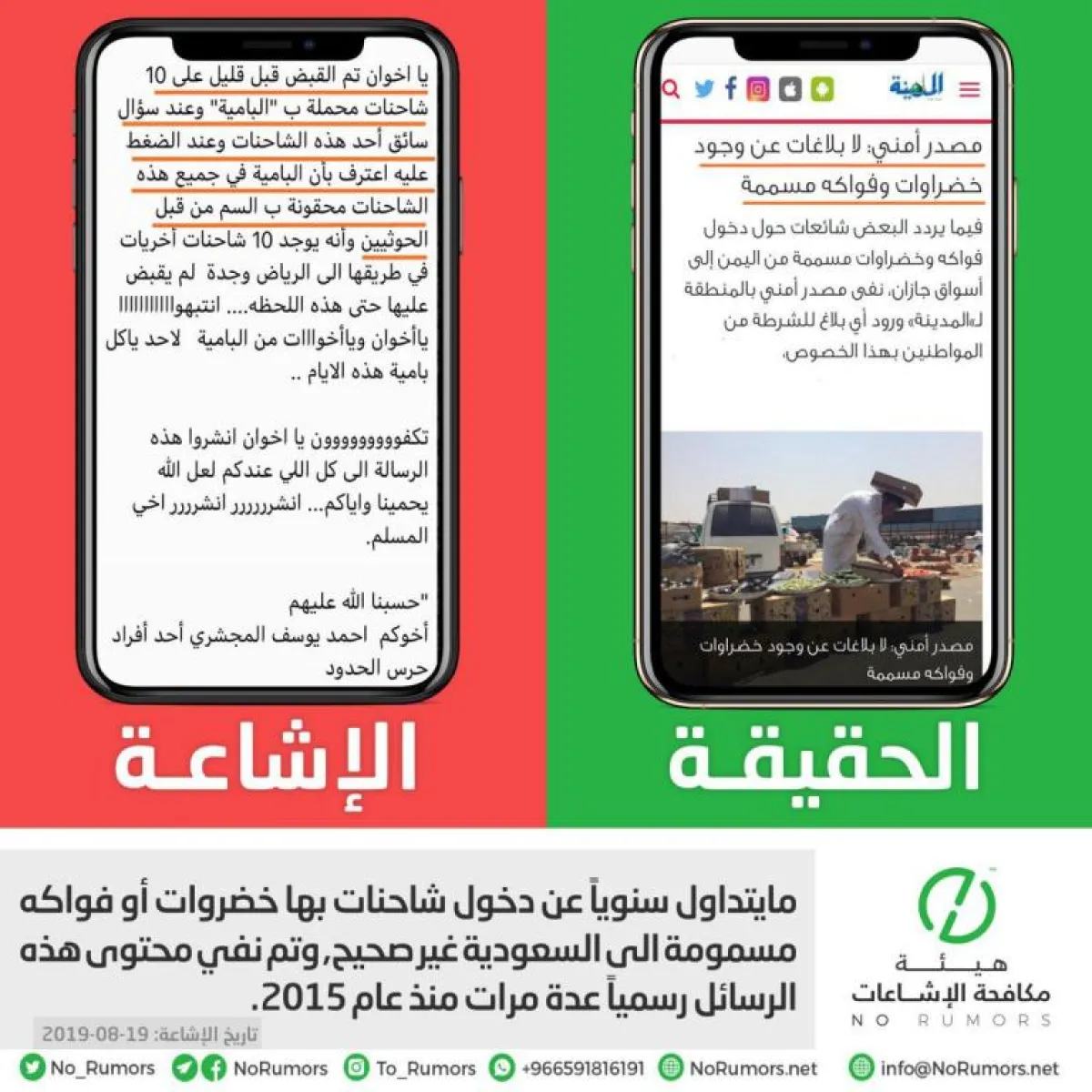 وفي هذا الصدد، فقد كشفت هيئة مكافحة الإشاعات، عبر حسابها الرسمي على موقع التواصل الاجتماعي «تويتر»، حقيقة ما يتم تداوله بشأن دخول شاحنات بها خضراوات أو فواكه «مسمومة» من اليمن إلى المملكة.