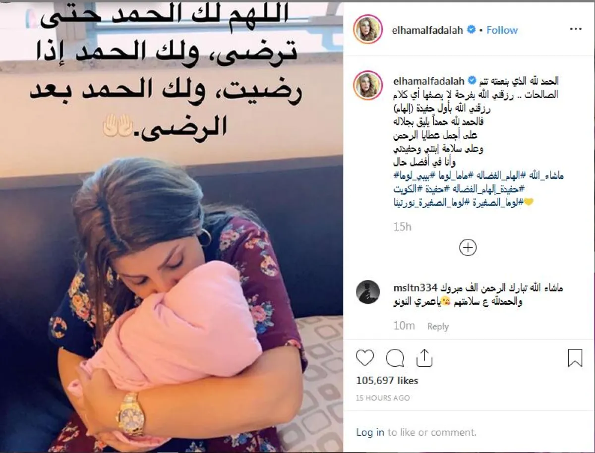 وبشَّرت إلهام بقدومها كاتبةً تعليقاً على الصورة: "الحمد لله الذي بنعمته تتم الصالحات. رزقني الله بفرحة لا يصفها أي كلام، رزقني الله بأول حفيدة، إلهام، فالحمد لله حمداً يليق بجلاله على أجمل عطايا الرحمن وعلى سلامة ابنتي وحفيدتي، وأنا في أفضل حال".