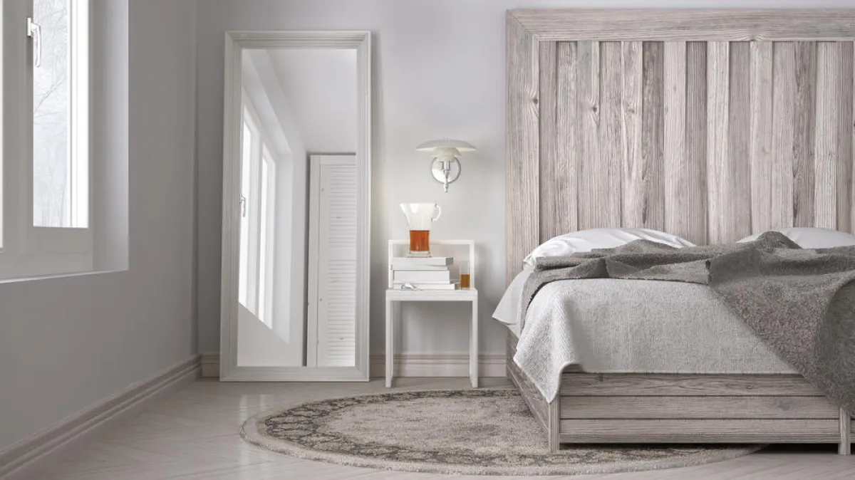 • يمكن تغطية كامل الجدار بالخشب، واختيار السرير الخالي من الرأسيَّة (برواز)، مع تثبيت لوح من الخشب خلفه. وعلى جانبيِّ السرير، يوضع صندوقان من الخشب يحتوي كلٌّ منهما على درج. ويتمُّ العمل على الإنارة من خلال "كورنيش" نافر في السقف يحتوي على "سبوتات"، أو زوجين من الثريات ينسدلان فوق الصندوقين على جانبيّ السرير.