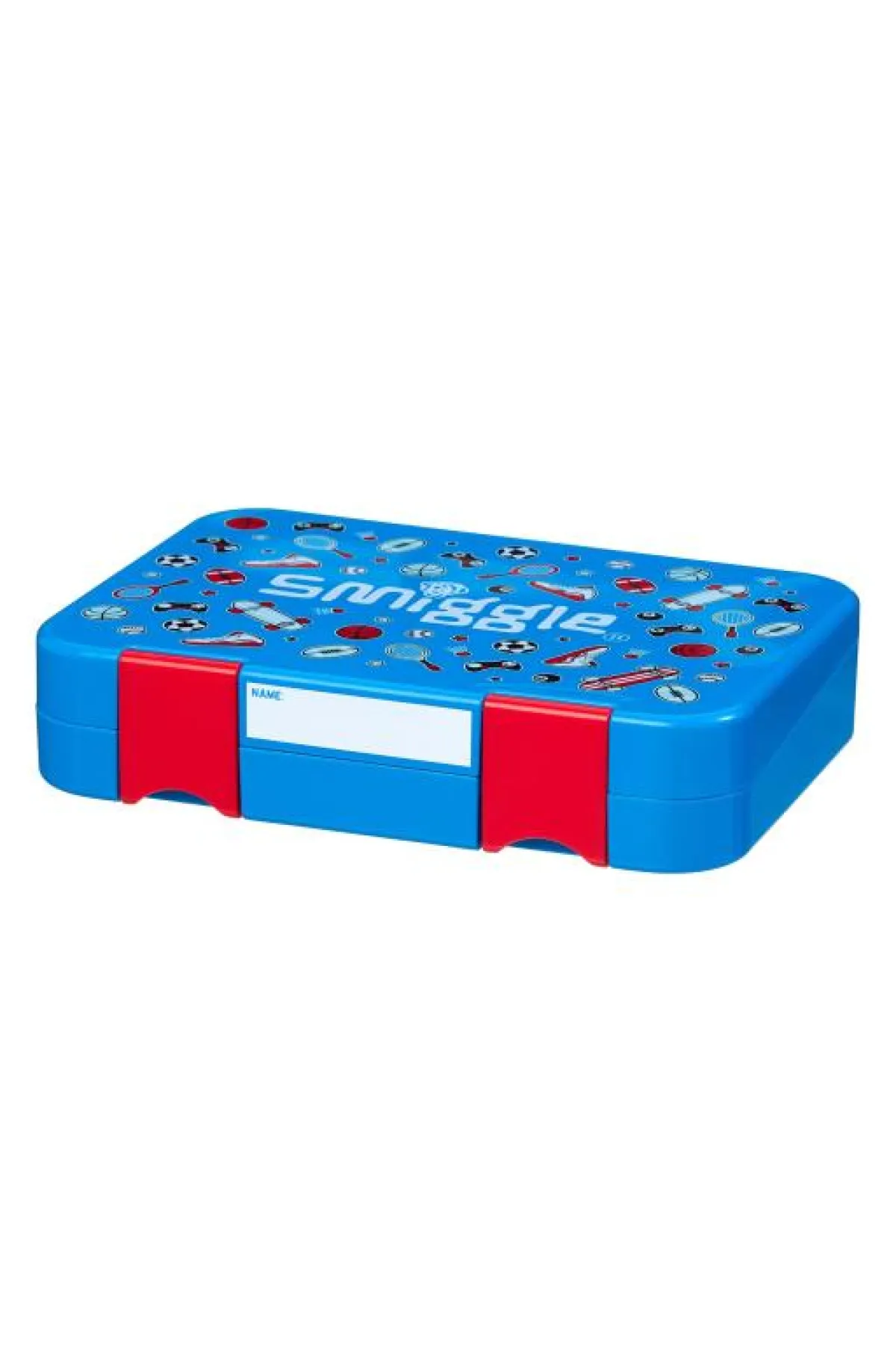 - «لانش بوكس» بلاستيكي باللون الأزرق مزين بالأحمر بسعر 124 ريالاً.