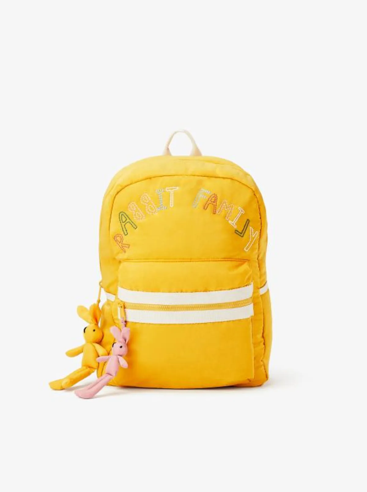 - حقيبة ظهر باللون الأصفر مع ميداليتين على شكل أرنب بسعر 169 ريالاً.