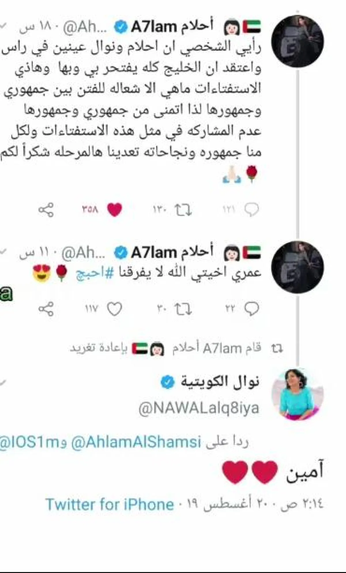 كما نشرت أحلام تغريدة ثانية توجهت من خلال إلى نوال الكويتية قائلة "عمري أختي الله لا يفرقنا. احبك"، فما كان من نوال الكويتية إلا أن ردت عليها"آمين"، للتأكيد على رأيها وعلى صداقتهما وعلاقتهما الجيدة التي ادت إلى طبيعتها، بعد سنوات طويلة من الخلافات.