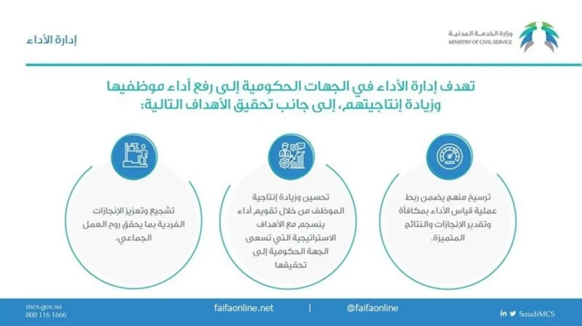 وأضافت وزارة الخدمة المدنية، أنه من ضمن الأهداف، ترسيخ منهج يضمن ربط عملية قياس الأداء بمكافأة وتقدير الإنجازات والنتائج المتميزة، بالإضافة إلى تشجيع وتعزيز الإنجازات الفردية بما يحقق روح العمل الجماعي.