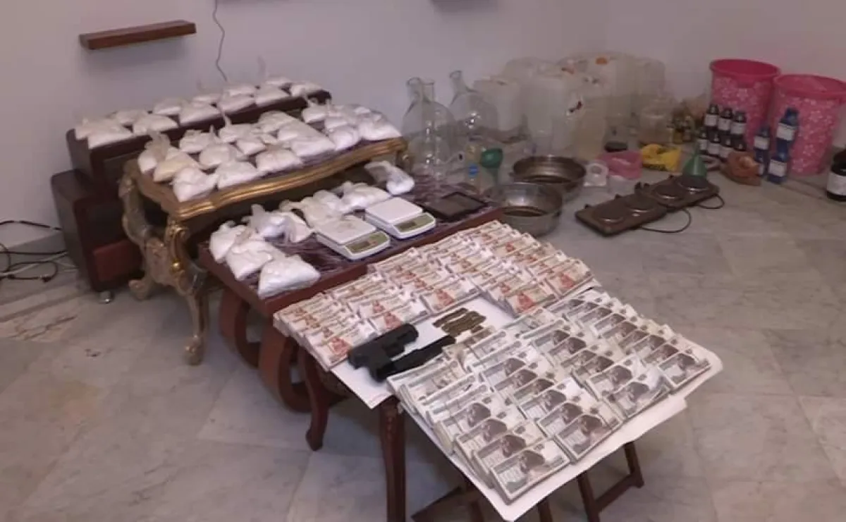 وتابع البيان الأمني عقب تقنين الإجراءات أنه تم ضبط ثلاثة منهم حال وجودهم بمعمل لتجهيز المخدر، كائن بدائرة قسم شرطة أول أكتوبر، وأسفرت عمليات التفتيش عن ضبط كمية من مخدر الآيس (الجاف– الخام والمُعد للتجفيف)، وزنت (72،650) كيلو و(2) طبنجة و(2) خزانة طبنجة- (45) طلقة عيار 9 مم وطبنجة صوت - عدد (7) طلقات صوت، ومبلغ مالي قدره (152،800) جنيه و(12) هاتف محمول، عدد (5) ميزان حساس و(3) سيارات «ملاكي»، وباستكمال التحريات وتطوير مناقشة المتهمين تبين قيام عناصر التشكيل بإعداد وتجهيز معمل آخر بمحافظة الإسكندرية؛ لتصنيع وإنتاج كميات كبيرة لذات المخدر داخل (فيلا) كائنة بدائرة قسم شرطة الدخيلة بمديرية أمن الإسكندرية، وتم تفتيش الفيلا وعثر على كمية من مخدر الآيس (الجاف- الخام مُعد للتجفيف) وزنت (22) كيلو جراماً وطبنجة معدلة عيار9مم بالخزانة الخاصة بها، و(47) طلقة نارية مختلفة الأعيرة ومبلغ مالي قدره (1.132،800) مليون ومائة واثنان وثلاثون ألفاً وثمانمائة جنيه و(4) موازين حساسة وسيارات «ملاكي».