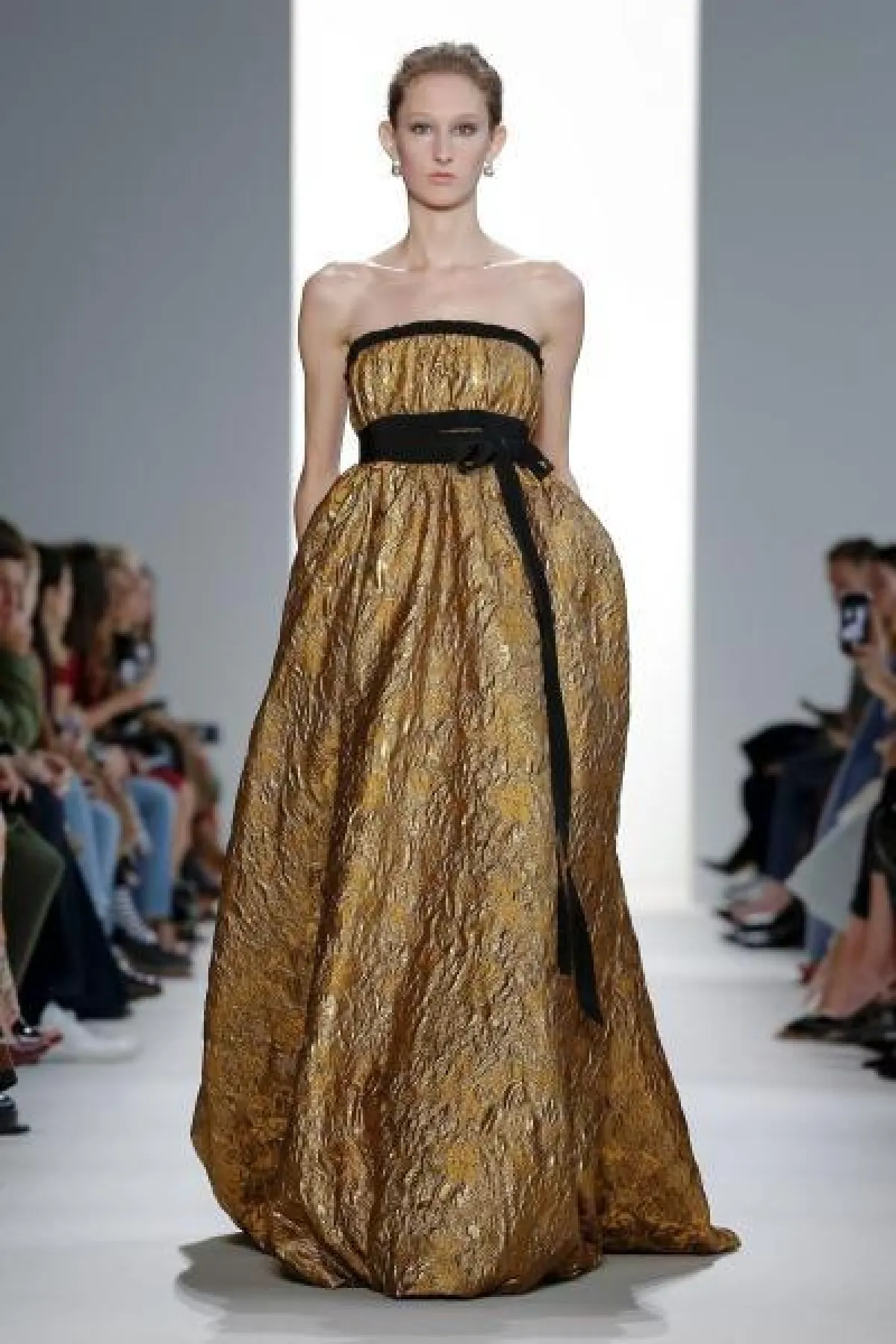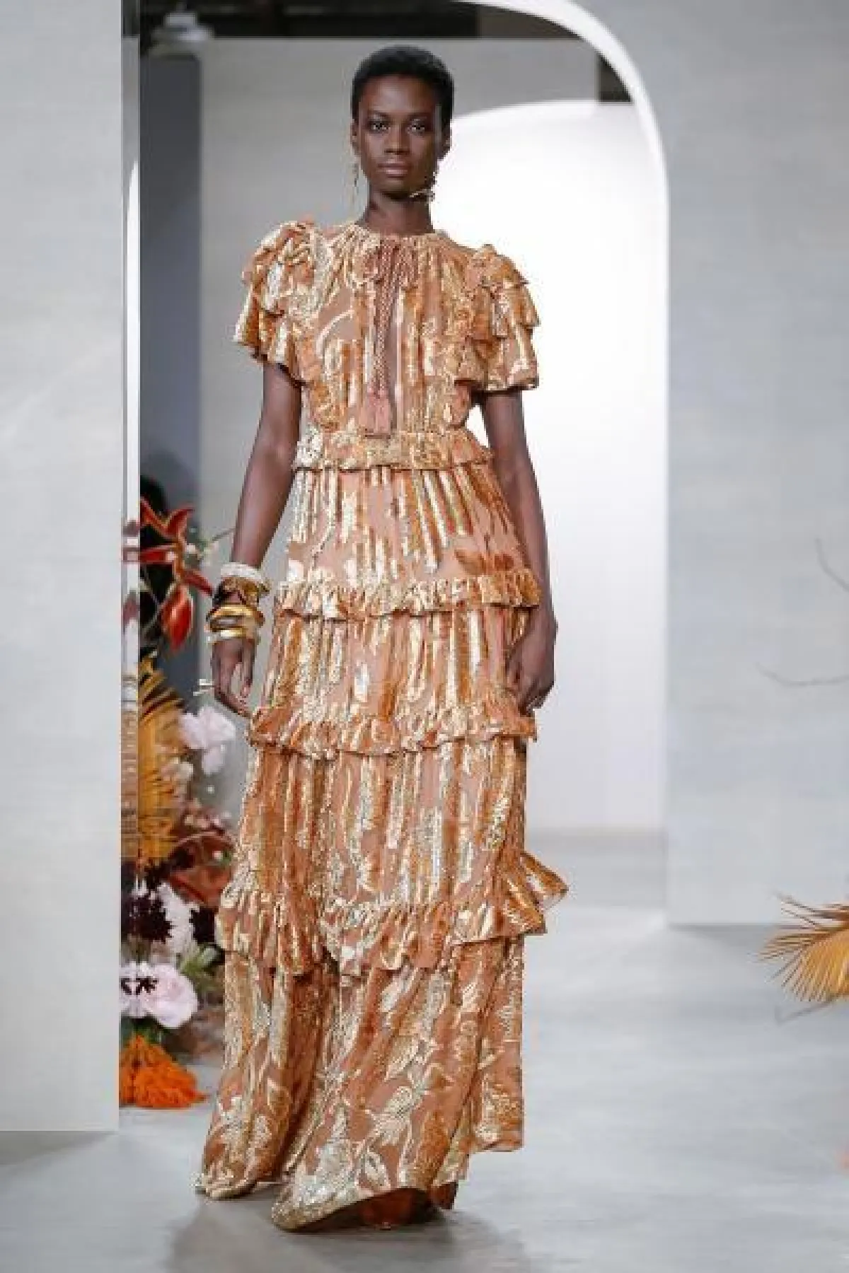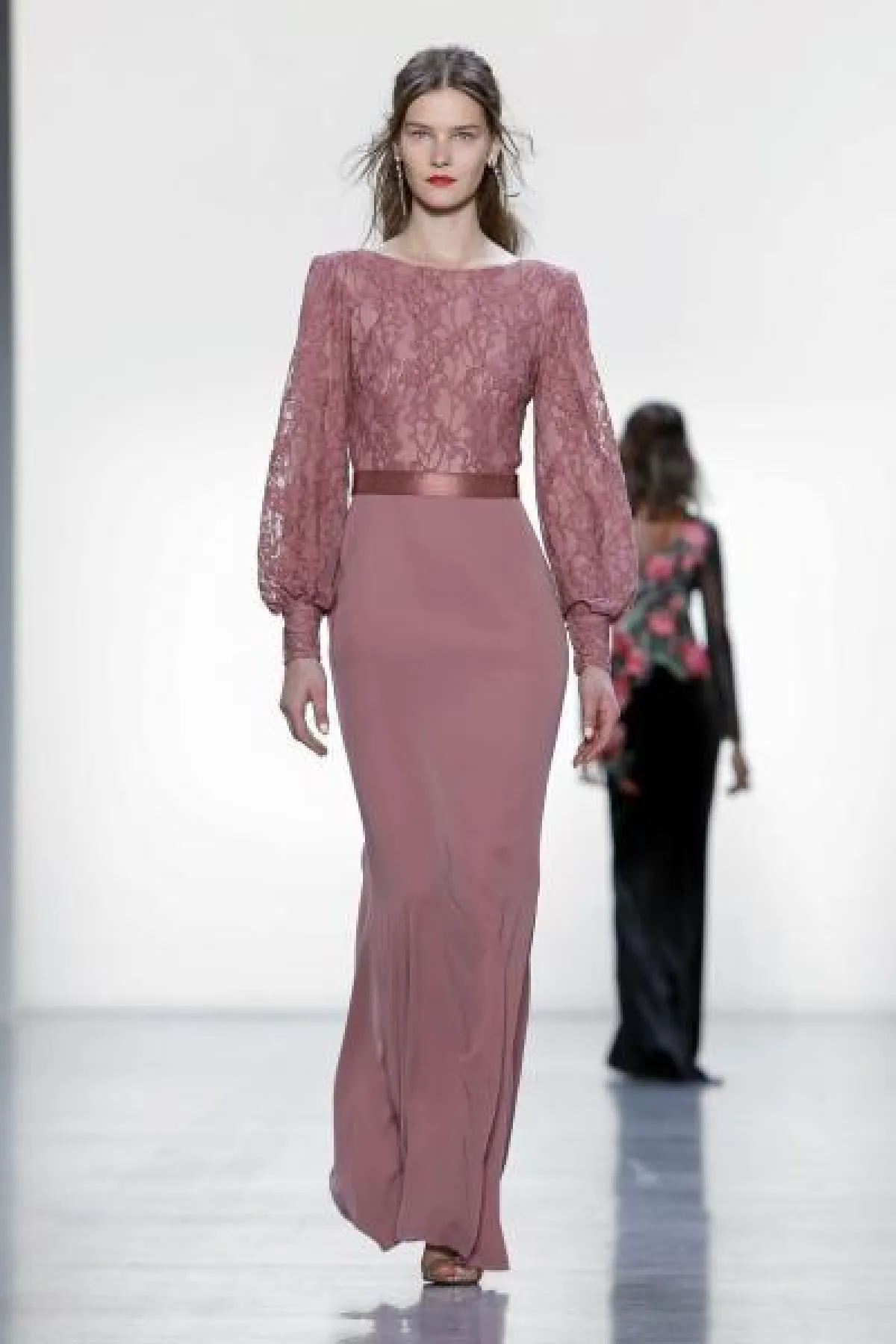 - شهدت منصات العروض صيحة فائقة الأناقة مستوحاة من العصر الفيكتوري وتمثلت في الفساتين ذات الياقات المكشكشه العالية، وأجمل تصميم برأينا هو الفستان الموقع من ماركة باميلا رولاند Pamella Roland.