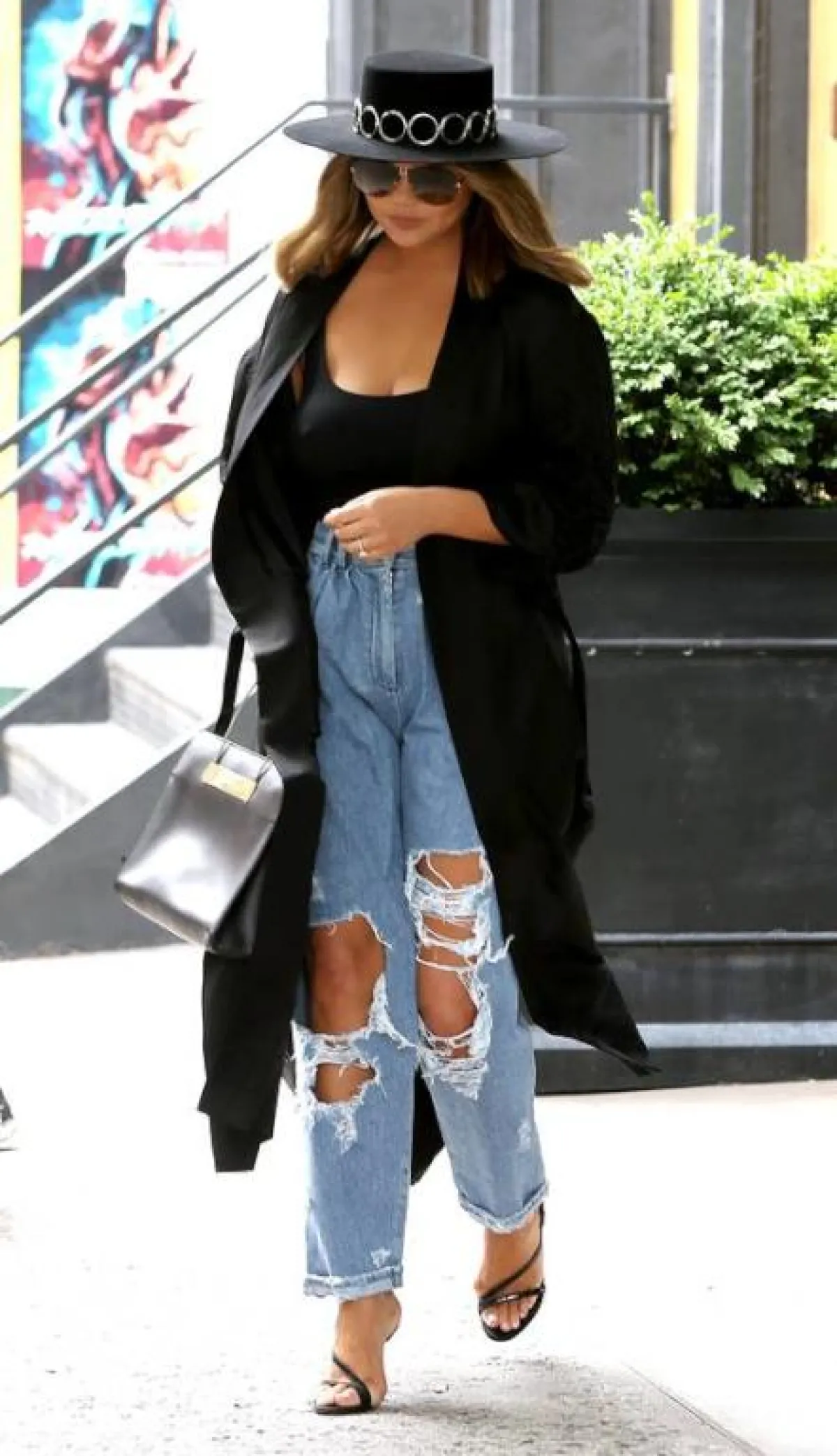 اعتمدت كريسي تيغن جينز مزود بحزام في الخصر مع طيات خفت تفاصيل البطن، نسقت "تيغن" الجينز مع بليزر عصري و صندل بشرائط أمامية وكعب عالِ.
